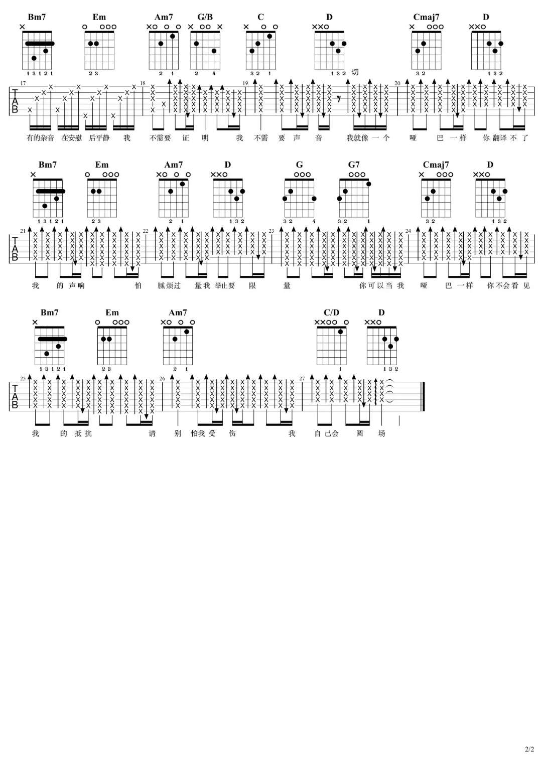 曲谱介绍: 《哑巴》吉他谱选用G调,变调夹夹2品。整首歌曲对弹的要求并不高,一些简单的和弦,一些不难的节奏型。薛之谦的歌曲大部分比较难唱,这首歌也不例外,在唱这首歌的时候你应该得理解他的感情先。