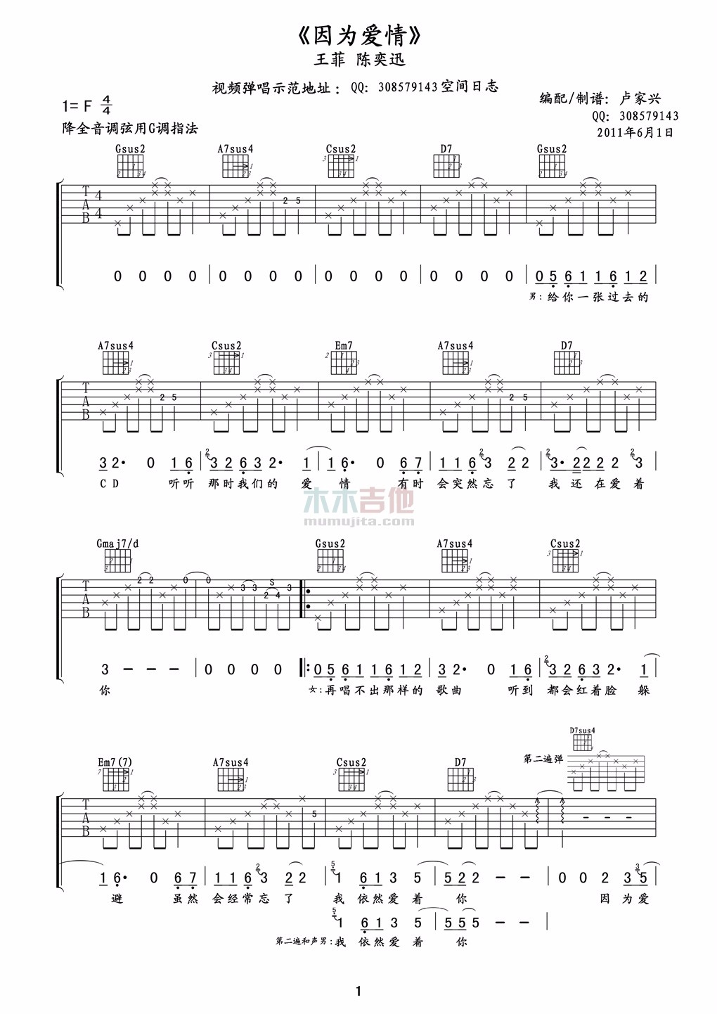 曲谱介绍: 《因为爱情》吉他谱原调F调,降全音调弦,用G调指法,卢家兴制谱编配。这张谱子算是比较简单的一个版本,没有太多的花里呼哨,适合新手学习和练习,一首经典的歌曲值得收藏。