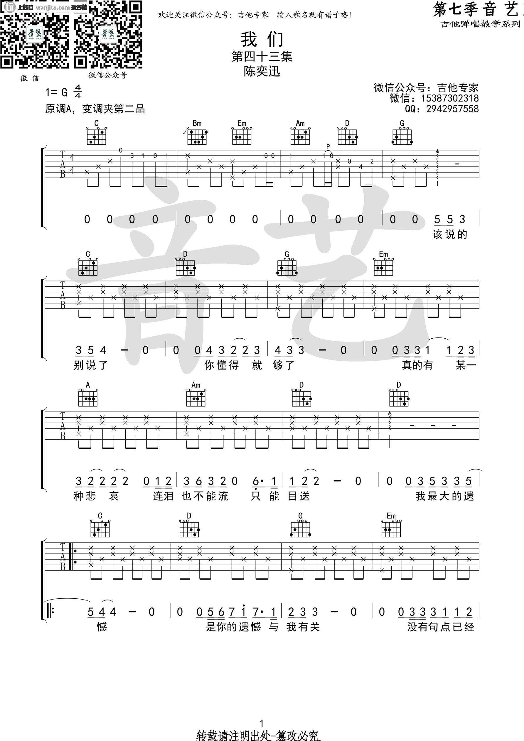 曲谱介绍: 《我们》吉他谱原调G调,变调夹夹二品。这首歌曲·的演唱比较有难度,弹起来倒是很容易,适合新手练习弹,但是要想唱出来还是需要一定的唱歌功底的。
