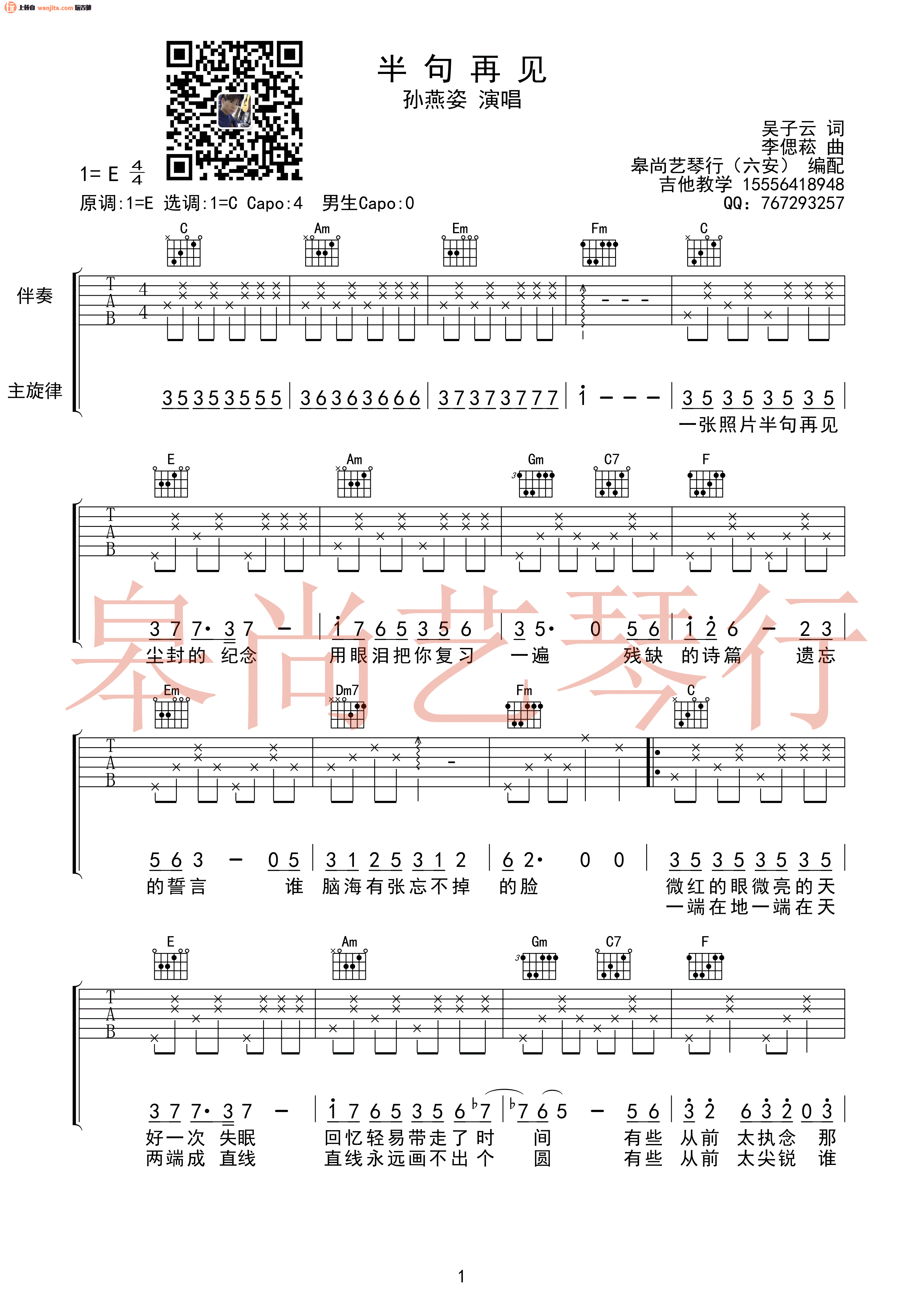 曲谱介绍: 《半句再见》吉他谱原调E调,选用C调,不使用变调夹。这首歌曲需要注意的是前奏部分,需要多加练习,还有右手的一些变换,弹唱的结合。吉他弹唱能给这首歌带来不少故事感。我推荐大家学习这首好听的歌曲。