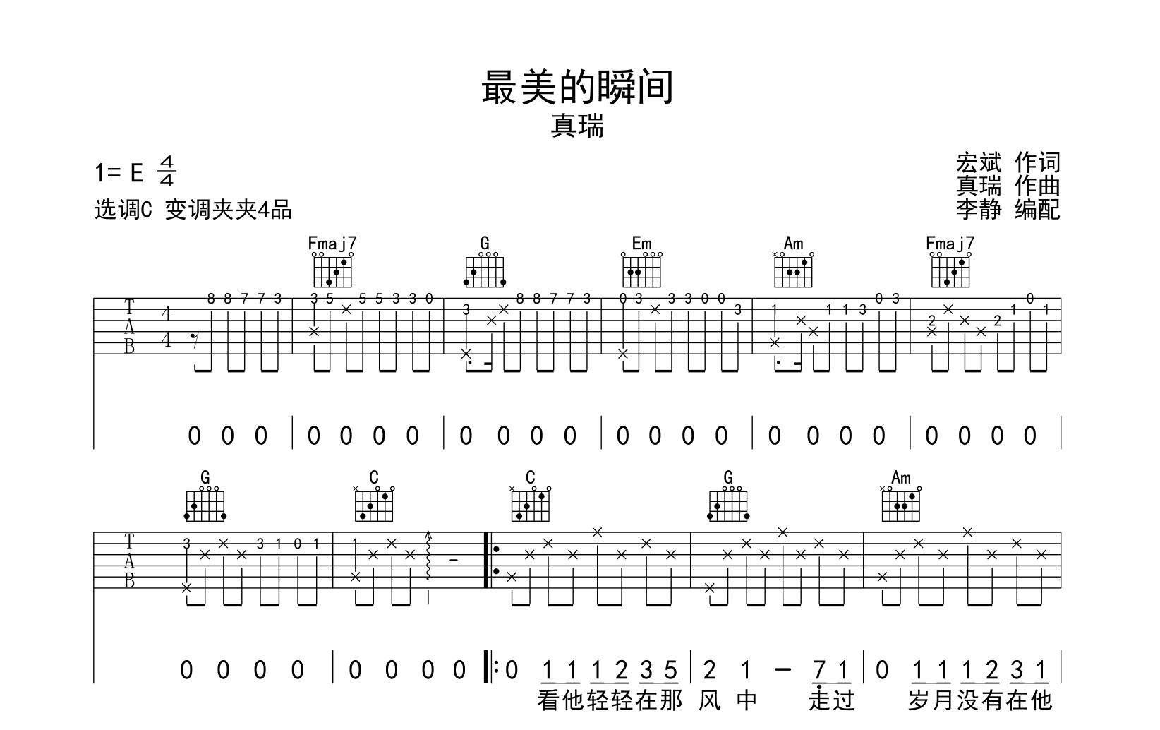 曲谱介绍: 真瑞《最美的瞬间》吉他谱,由@李静制谱,《最美的瞬间》吉他弹唱谱,共有三张图片谱,本谱采用C调和弦指法编配,原调E调,节奏4/4拍,曲速70拍每分钟,弹唱建议变调夹夹4品,指法简单。