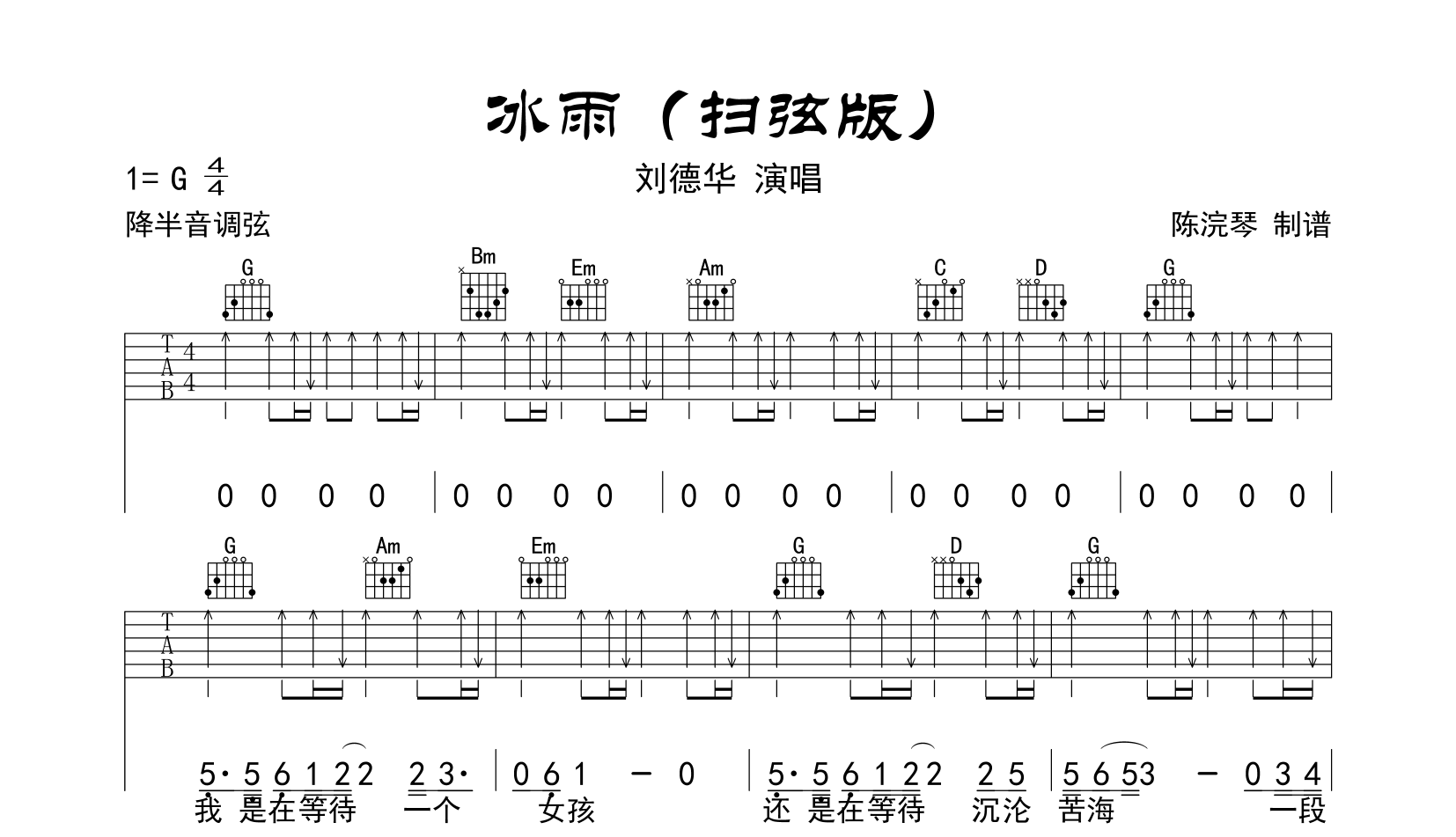 曲谱介绍: 冰雨吉他谱,刘德华演唱的一首歌曲,《冰雨》吉他六线谱,共有两张图片谱,选用G调编配,扫弦版节奏弹唱全曲,降半音调弦,难度初级简单,本谱由@陈浣琴制谱上传。