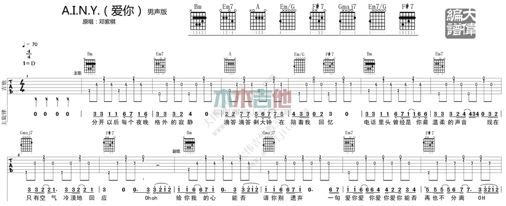 A.I.N.Y.爱你吉他谱 - 大伟吉他 - D调吉他弹唱谱 - 原版