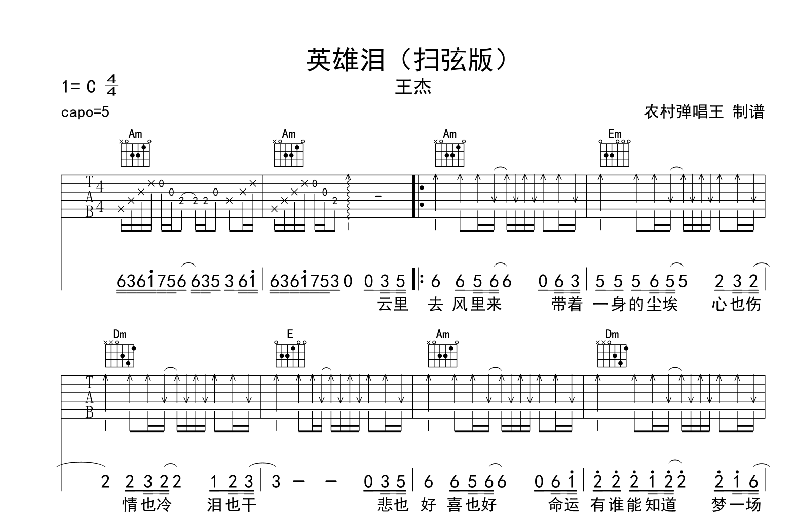 曲谱介绍: 英雄泪吉他谱,王杰演唱的一首经典歌曲,《英雄泪》六线谱,本吉他谱采C调指法编配,原调变调夹夹第5品演奏,也可以根据个人嗓音条件灵活选择变调夹,演奏的速度控制在每分钟75拍左右,指法很简单。演奏要点:本谱为纯扫弦版,运用到切分节奏,注意时值的间隔搭配,本谱来自农村弹唱王编配制作。