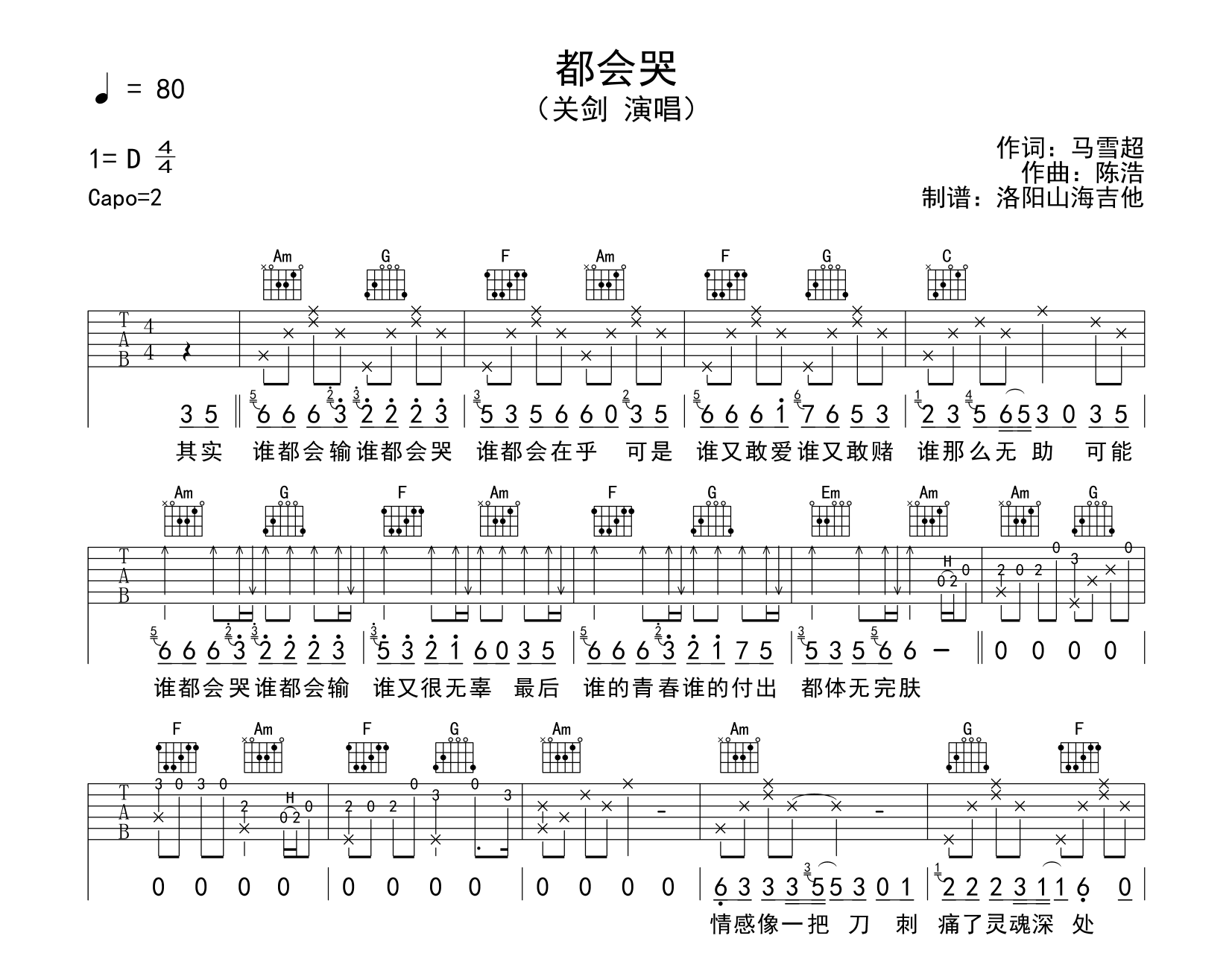 曲谱介绍: 关剑《都会哭》吉他谱,由@飞韵吉他制谱,《都会哭》吉他弹唱谱,共有两张图片谱,选用C调指法,原调D调,节奏4/4拍,速度80BPM,建议变调夹夹2品弹唱,难度初级简单。