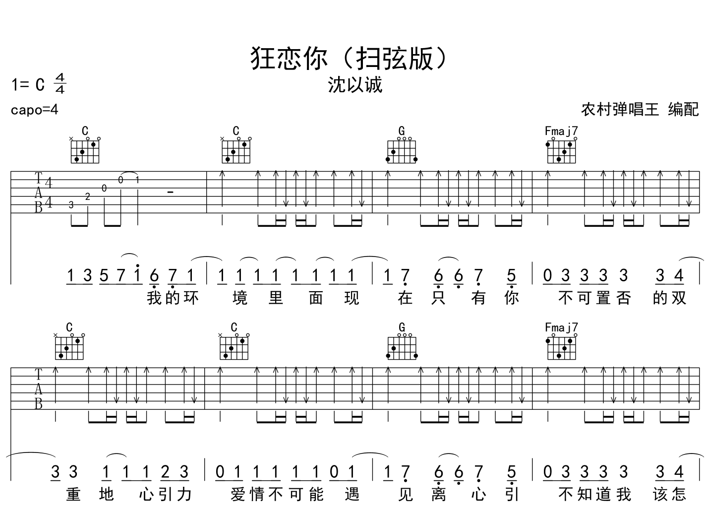 曲谱介绍: 狂恋你吉他谱,沈以诚演唱的一首歌曲,《狂恋你》吉他弹唱谱,共四张图片谱,采用C调指法编配,变调夹夹第4品演奏,也可以根据个人嗓音条件灵活选择变调夹,演奏的速度控制在每分钟90拍左右,指法简单。演奏要点:本谱为纯扫弦版,因此要格外注意扫弦力度的分配,要根据演唱时的感情增减力度,来自农村弹唱王编配制作。