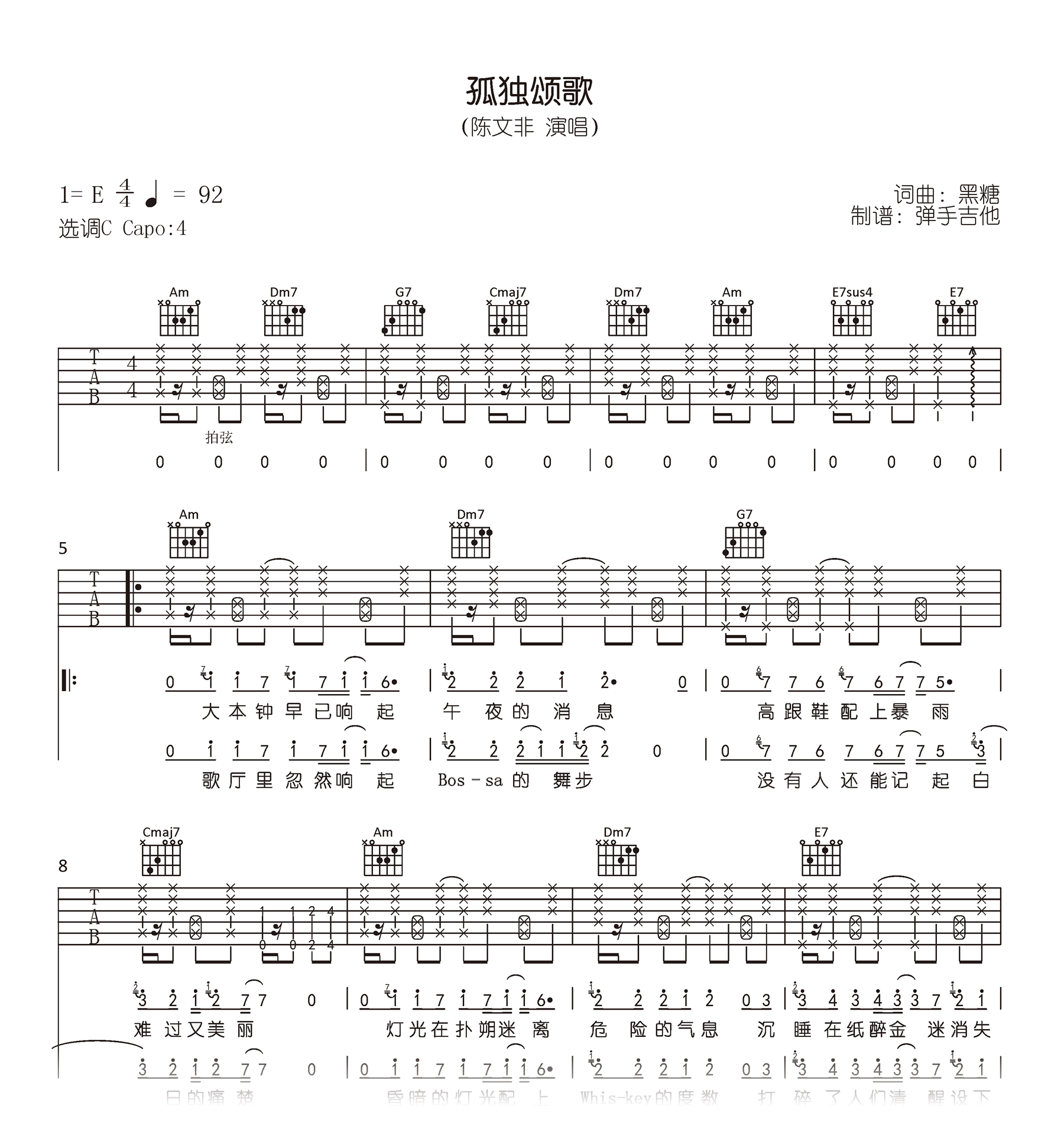 曲谱介绍: 《孤独颂歌》吉他弹唱六线谱,原调E选调C,CAPO夹四品,三张高清图片谱。