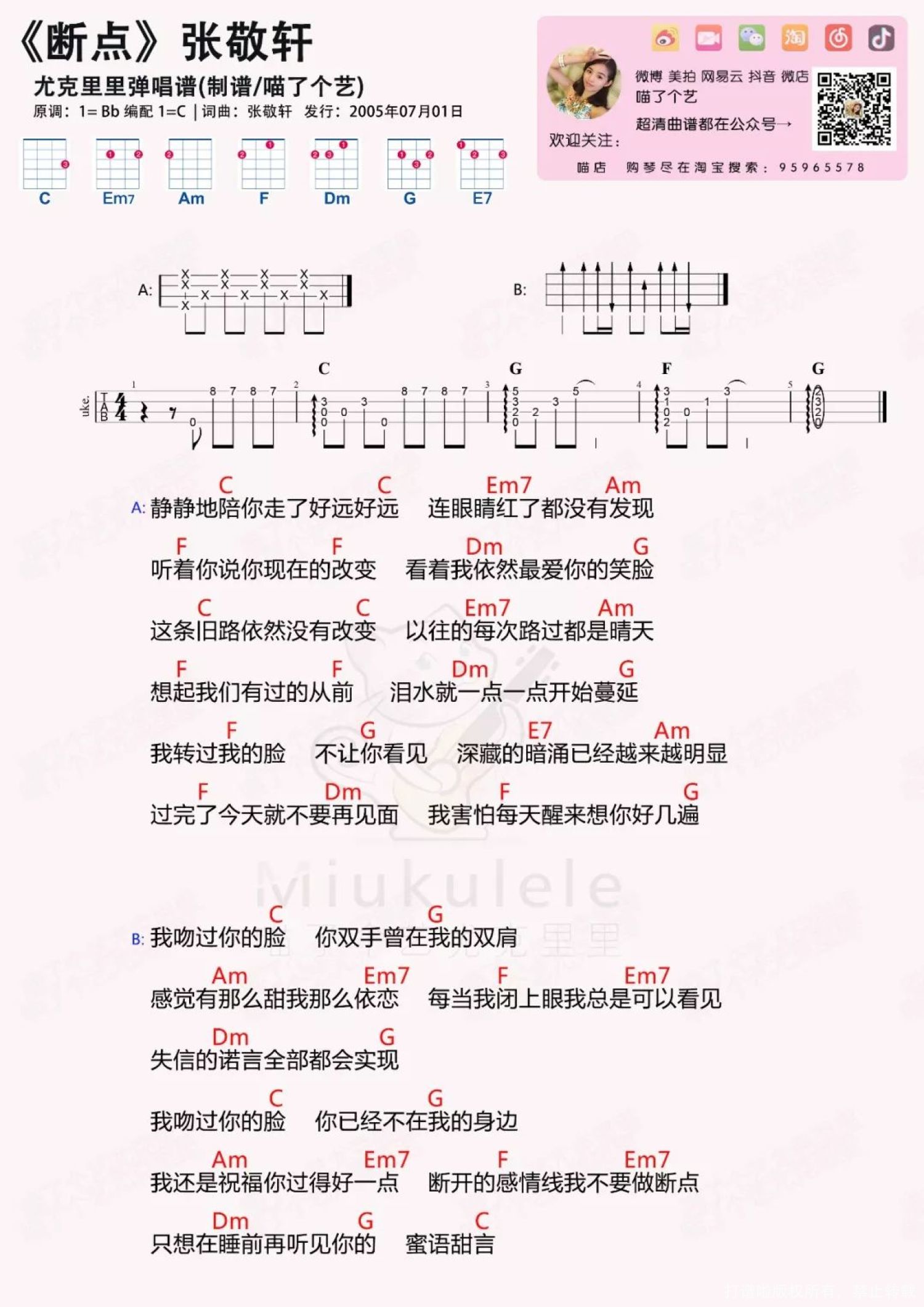断点尤克里里谱 - 张敬轩