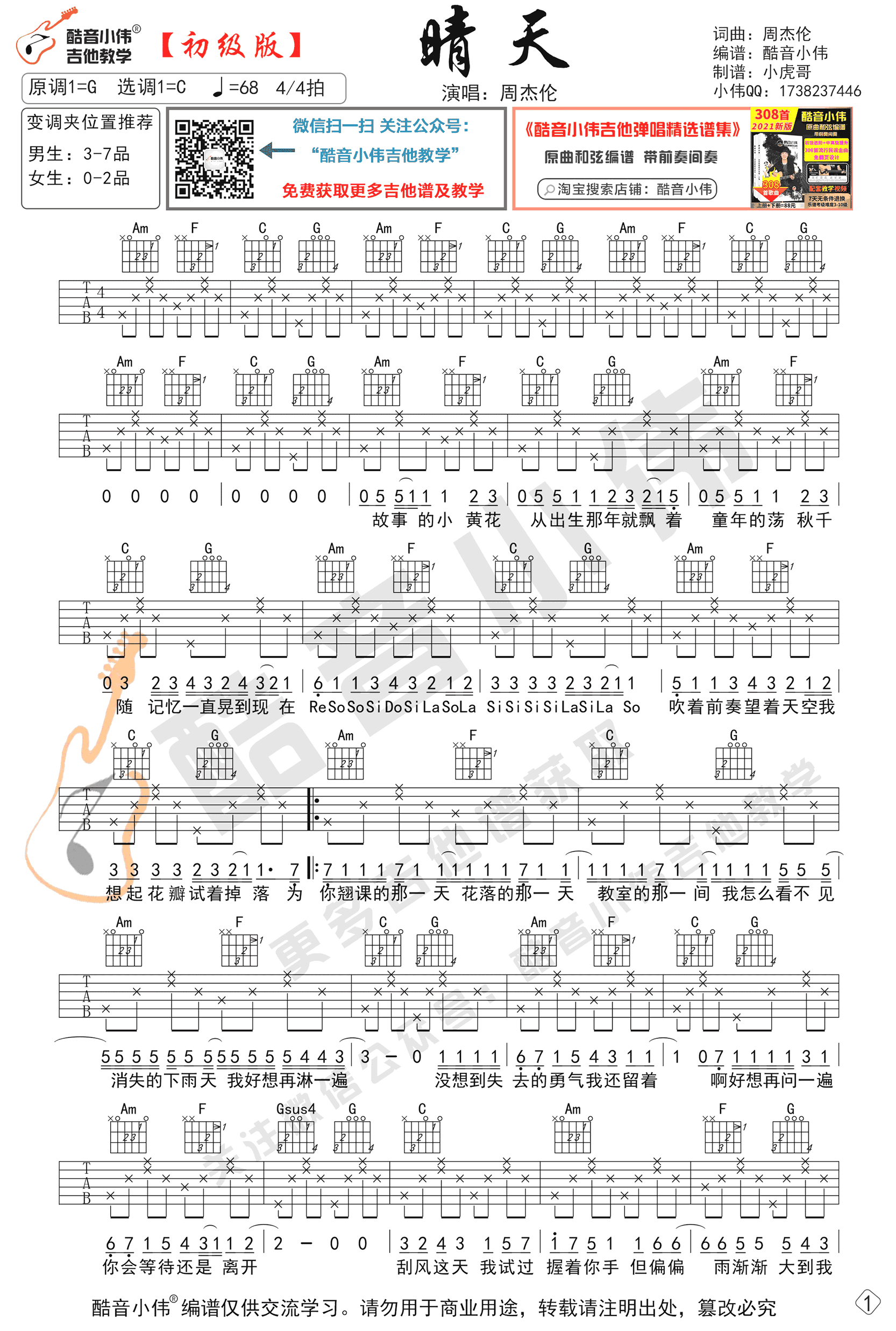 曲谱介绍: 《晴天》吉他谱,初级版弹唱谱,周杰伦的早期经典代表曲目,也是吉他新手入门必备歌曲哦。晴天吉他六线谱,原调G,选用C调编配,变调夹男生3-7品,女生建议0-2品位置,六线谱共两张高清图片谱子。满满回忆的旋律,仿佛带引我们重回校园时光,感受那份清新纯美的初恋滋味。