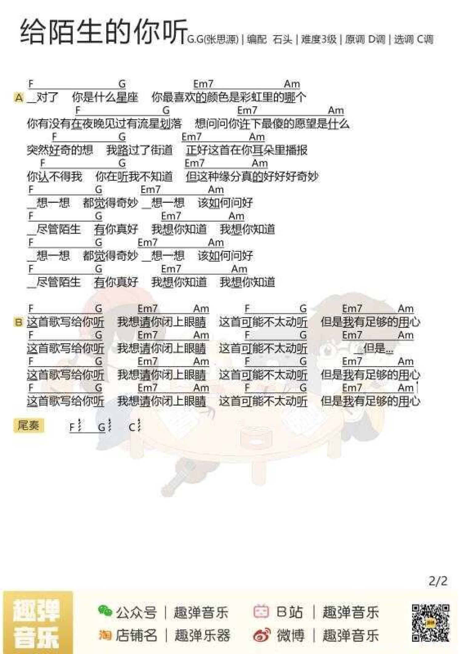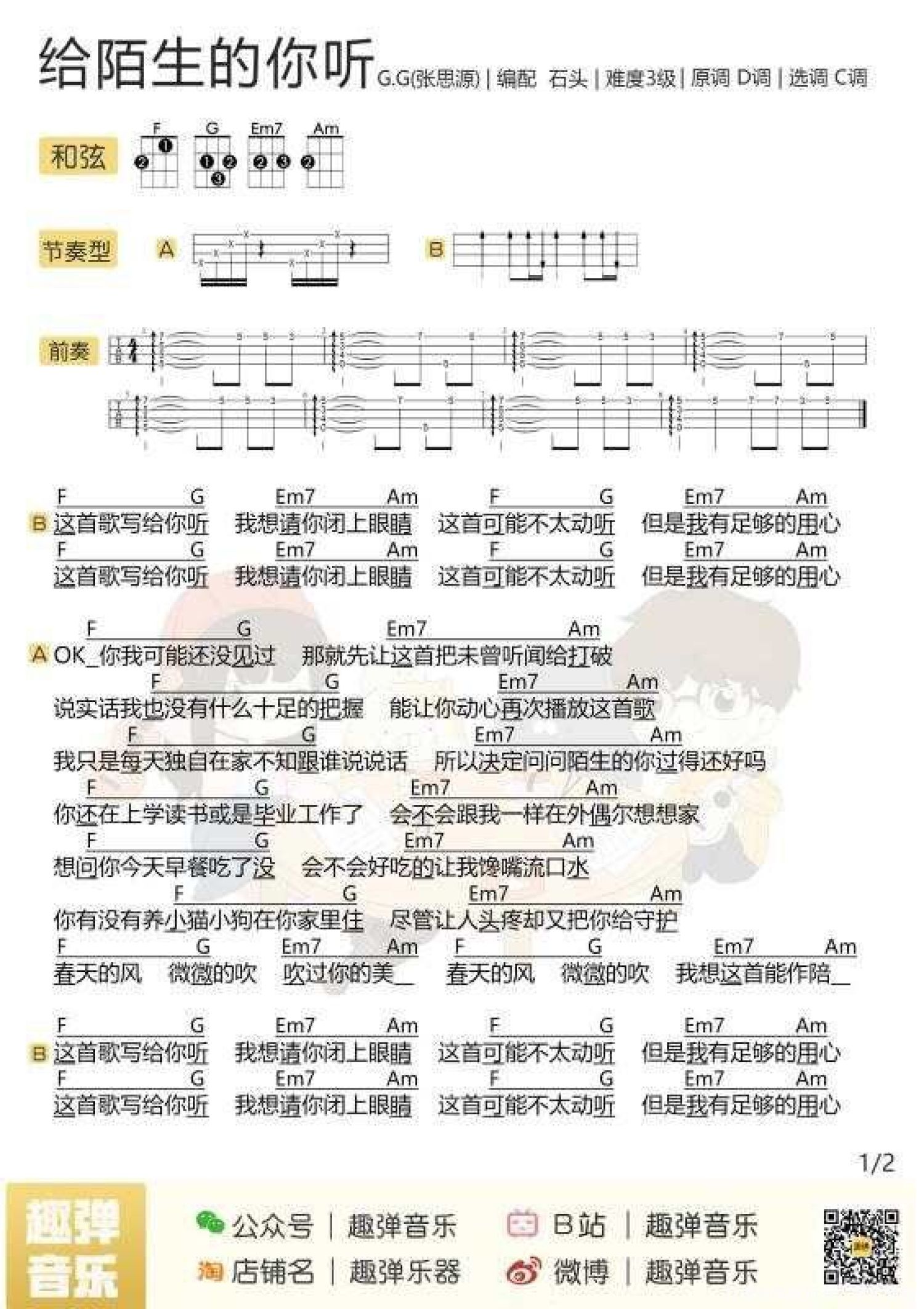 曲谱介绍: 《给陌生的你听》尤克里里弹唱谱 Aloha~ 制谱委员会来发歌啦 今天分享的是张思源的 「给陌生的你听」 路上你一定遇见了很多陌生人 可能每天相见却只是擦肩而过 就让这首歌 把未曾听闻打破~ 在陌生的城市里 随时都会被孤独感包围 但是别怕 你的心一直有人懂~