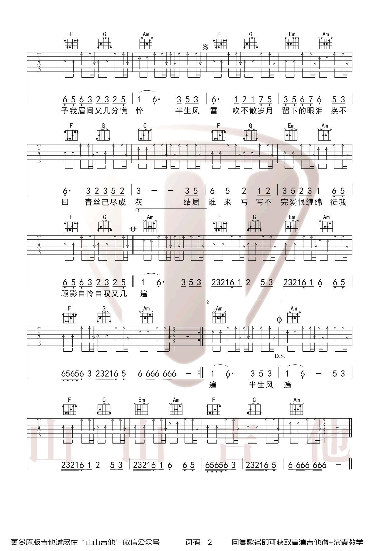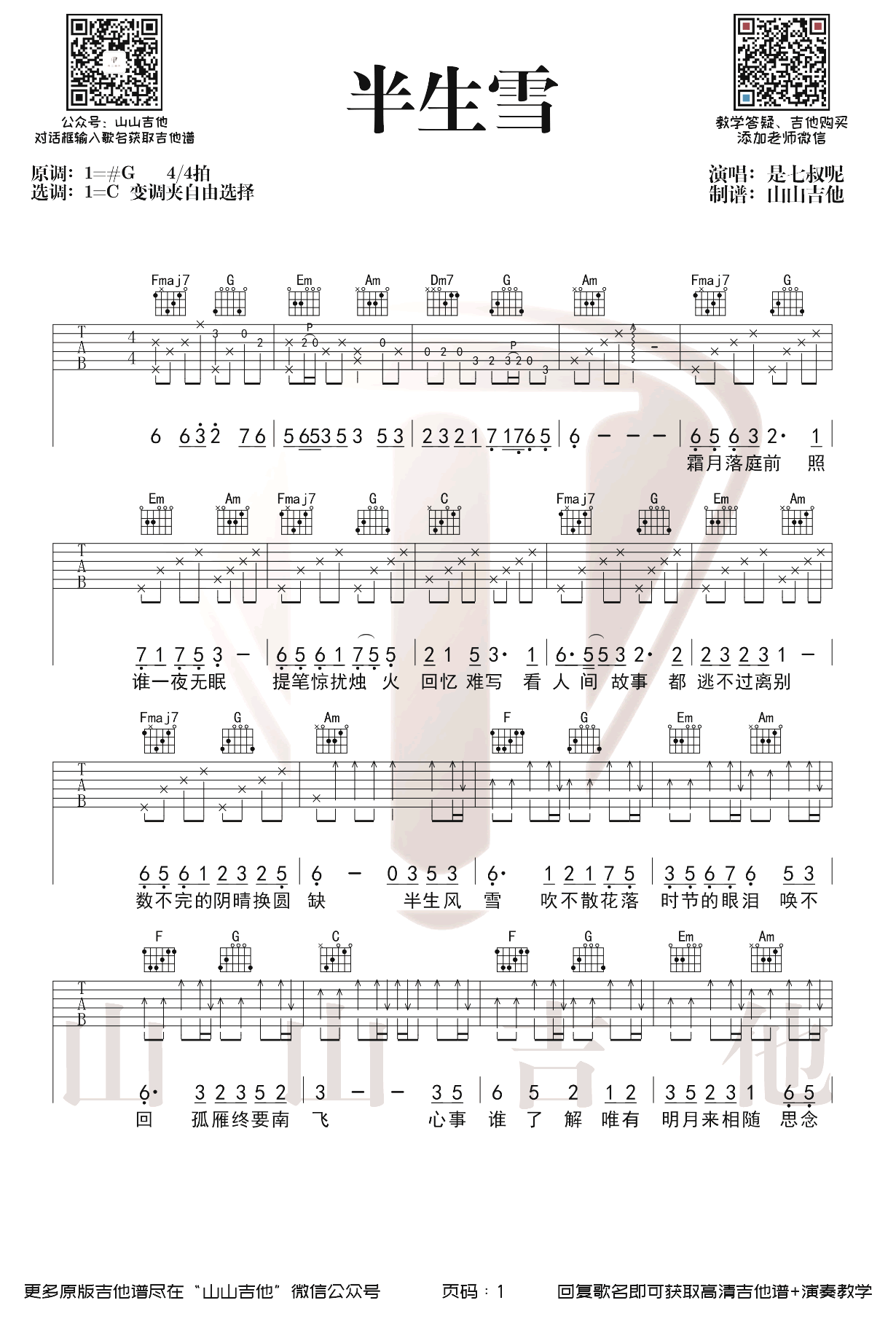 曲谱介绍: 是七叔呢《半生雪》吉他弹唱谱,采用C调指法编配,共有2张高清图谱,免翻页排版设计。