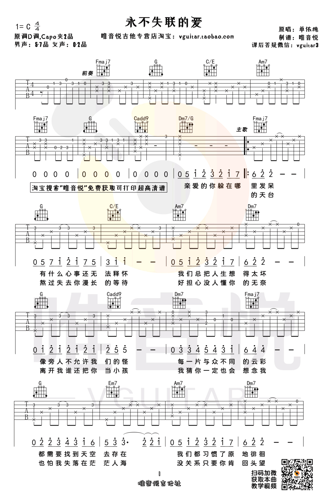 曲谱介绍: 单依纯唱火中国好声音节目的一首动听情歌,原唱是周兴哲。永不失联的爱吉他谱,原调D,选用C调,变调夹建议男生5-7品,女生夹二品。图片谱三张,简单版编配。单依纯的歌声里有一种干净纯粹的味道,于温柔中静静诉说故事,独特又撩人。