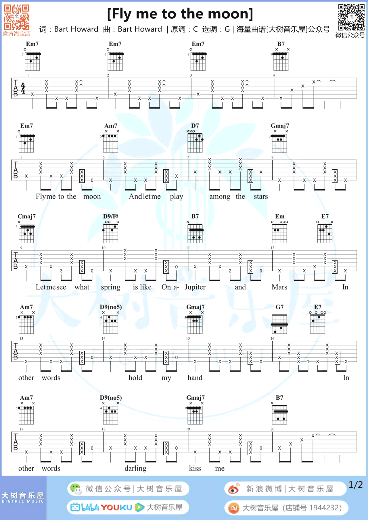 曲谱介绍: 带我去月亮吧吉他谱,一首经典的英文歌曲,《Fly Me To The Moon》吉他谱,原调C,选用G调指法,女生弹唱不需要变调夹,男生建议夹第二品,两张图片谱。随谱附上吉他弹唱教学视频,喜欢的同学们赶紧上手开始练习。