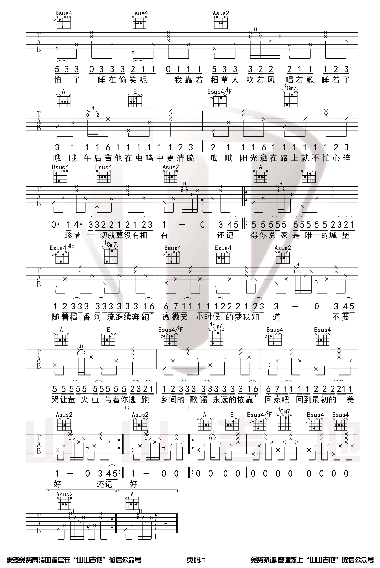 曲谱介绍: 周杰伦《稻香》吉他弹唱谱,采用A调指法编配,共有3张高清图谱。