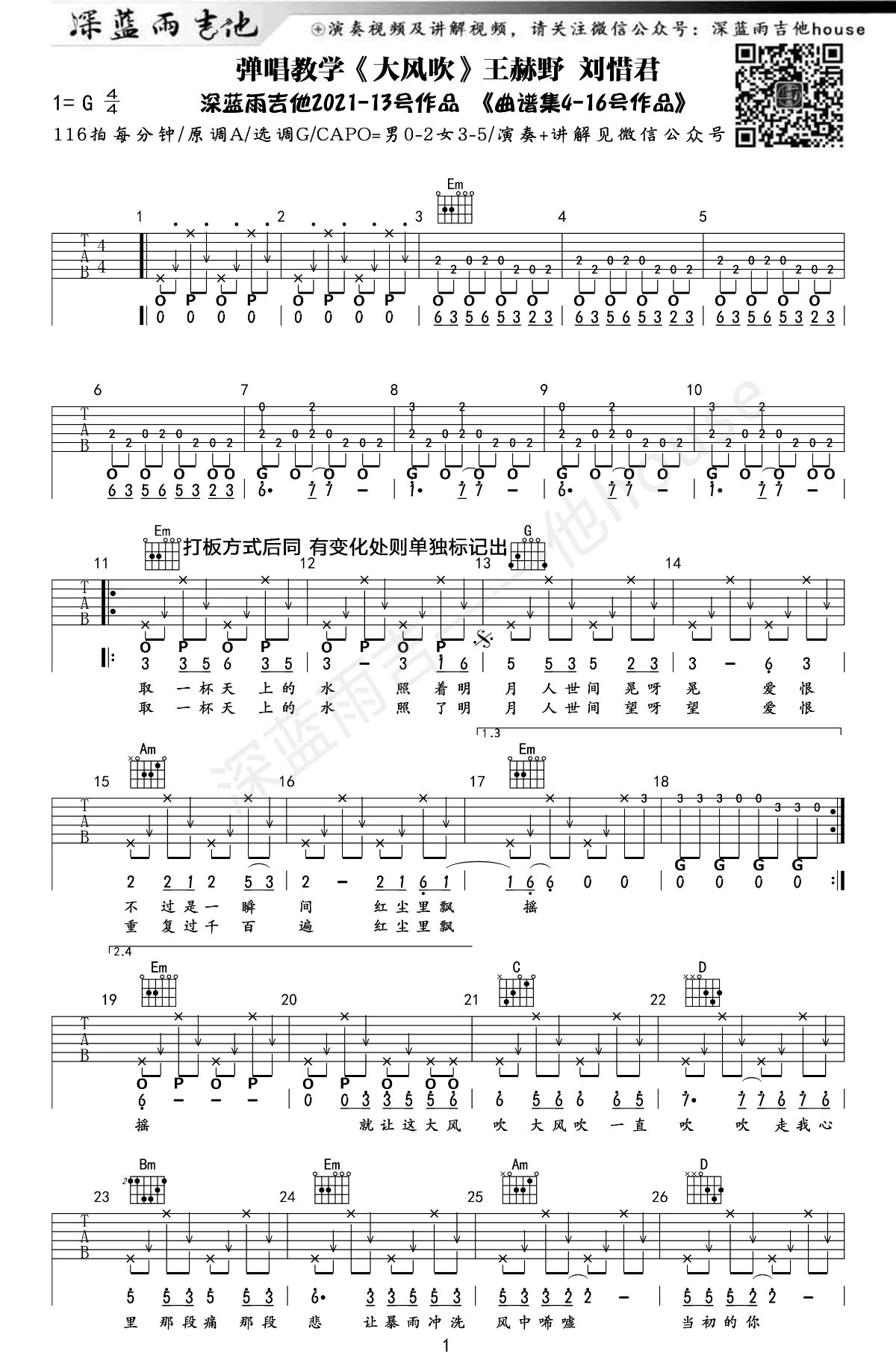 曲谱介绍: 大风吹吉他谱,深蓝雨吉他编配版本,附弹唱演示+教学讲解视频,歌曲原调A,选用G调指法,变调夹男生夹0-2品女生3-5品,四四拍每分钟116拍,两张图片谱。这首旋律动感洗脑的旋律火遍了全网,刮起了一阵复古迪斯科风,让人听了忍不住想随着音乐起舞。