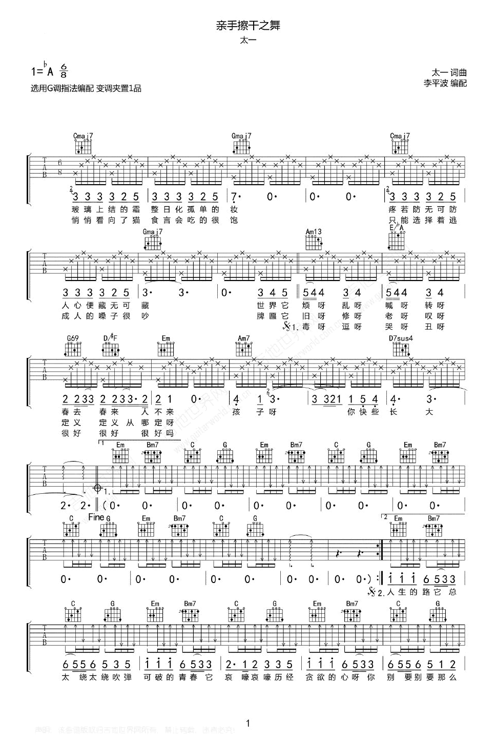 曲谱介绍: 亲手擦干之舞吉他谱,太一词曲演唱,亲手擦干之舞六线谱,原调降A,选用G调,变调夹建议一品,两张高清图片。人生的路它总 太绕太绕,吹弹可破的青春它 哀嚎哀嚎。是因为努力翻过那座山之后,发现并无风景,所以怀念儿时耸立在那里的高山吧。但是,要记得你说你是野草,所以春风吹又生吧。加油,所有的孩子。