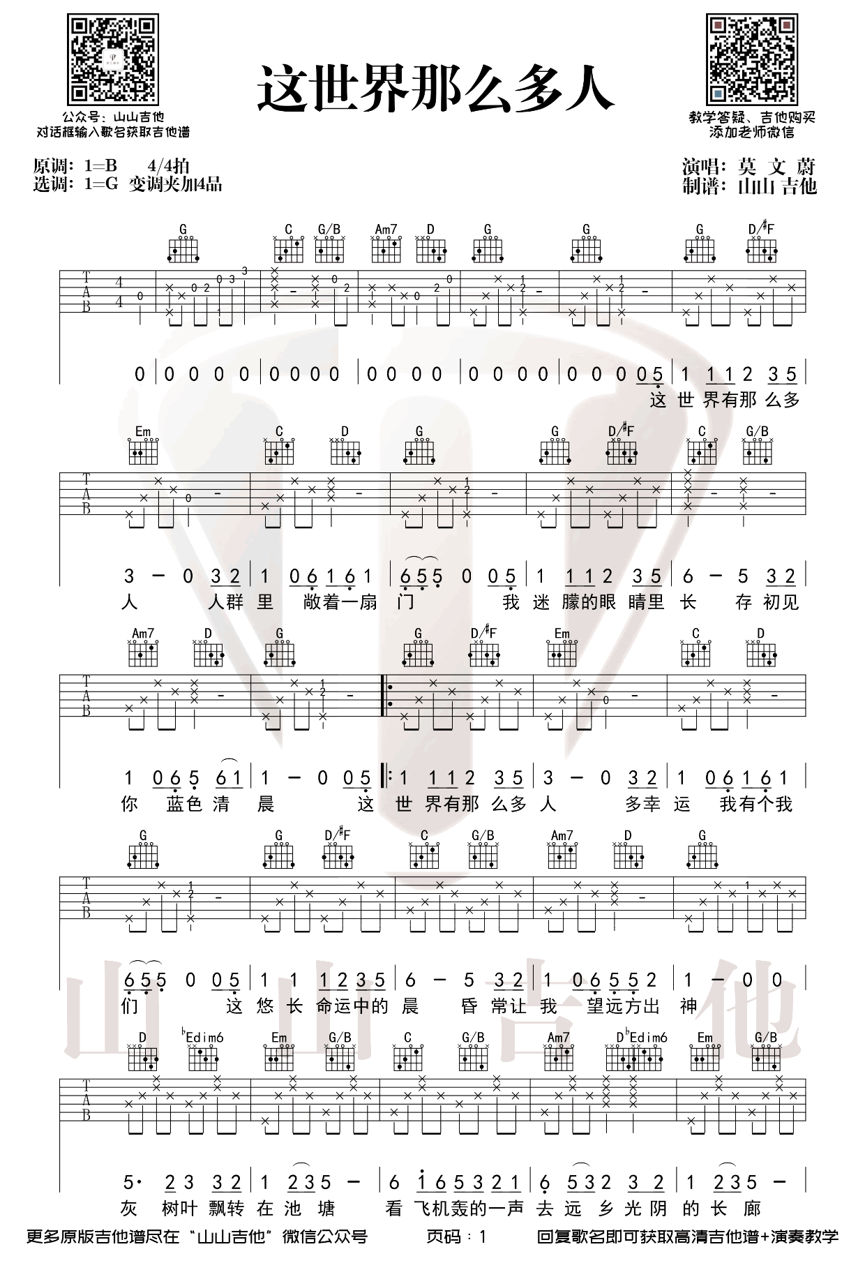 曲谱介绍: 莫文蔚的一首新歌,《我要我们在一起》电影主题曲。这世界那么多人吉他谱,G调,变调夹夹四品,两张图片六线谱。附上吉他弹唱演示视频,方便同学们参照练习。这世界那么多人,很幸运遇见你,一起度过彼此生命中的一段青春。温暖的歌声唱出我们每个爱恋与哀愁,也唱尽了拼尽全力对抗现实的辛酸苦楚。