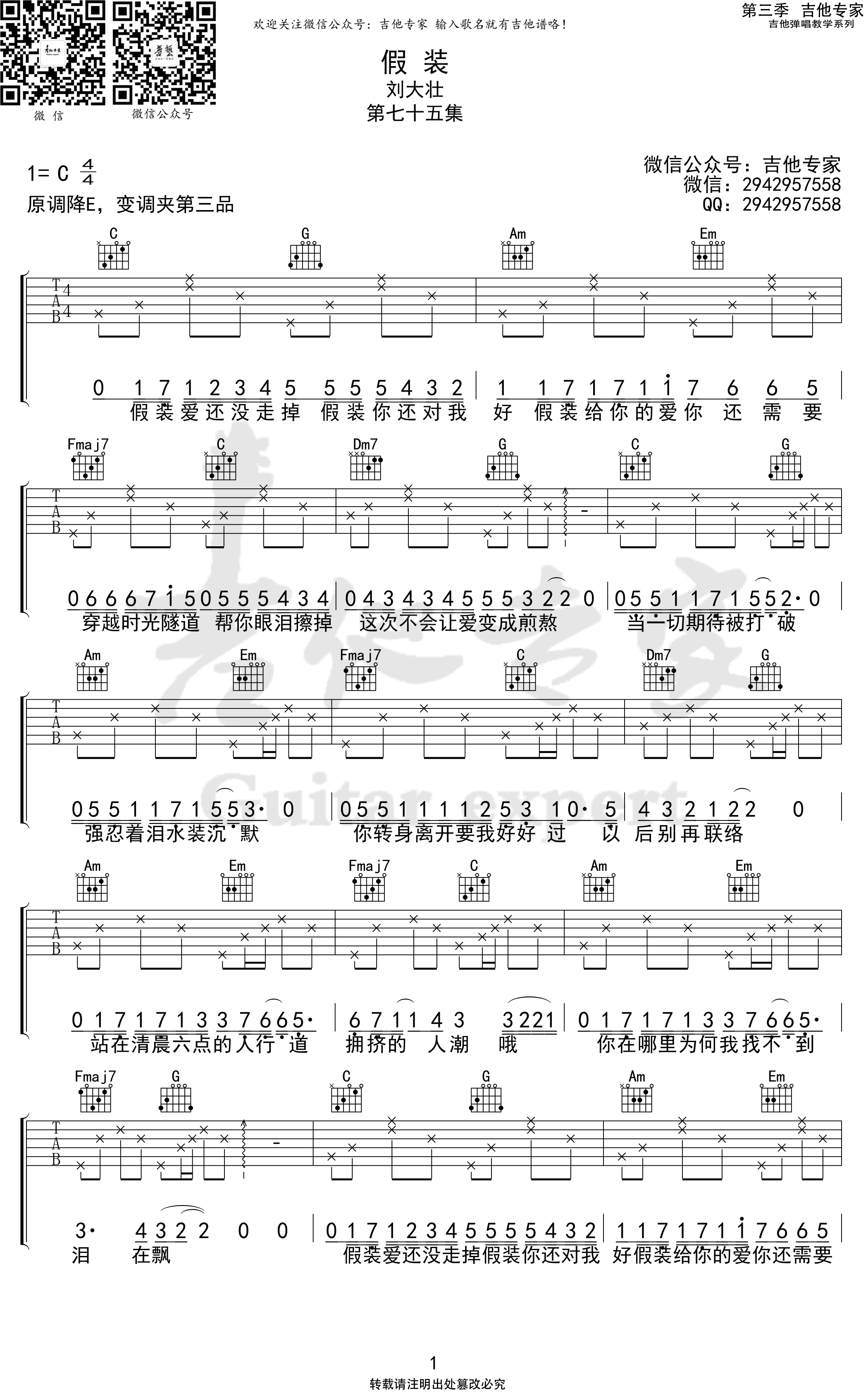 曲谱介绍: 刘大壮演唱,假装吉他谱,原调降E,变调夹夹第三品,选用C调指法,四张高清图片六线谱。假装弹唱谱,根据刘大壮的吉他版编配制作,同学们赶紧练习起来吧。其实所有纠结于过去的人,心里早就有了答案,只是假装自己还没得到答案。
