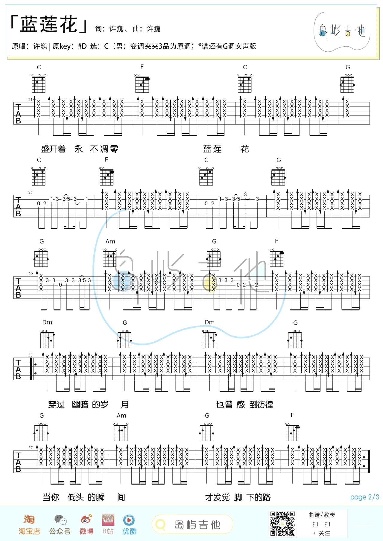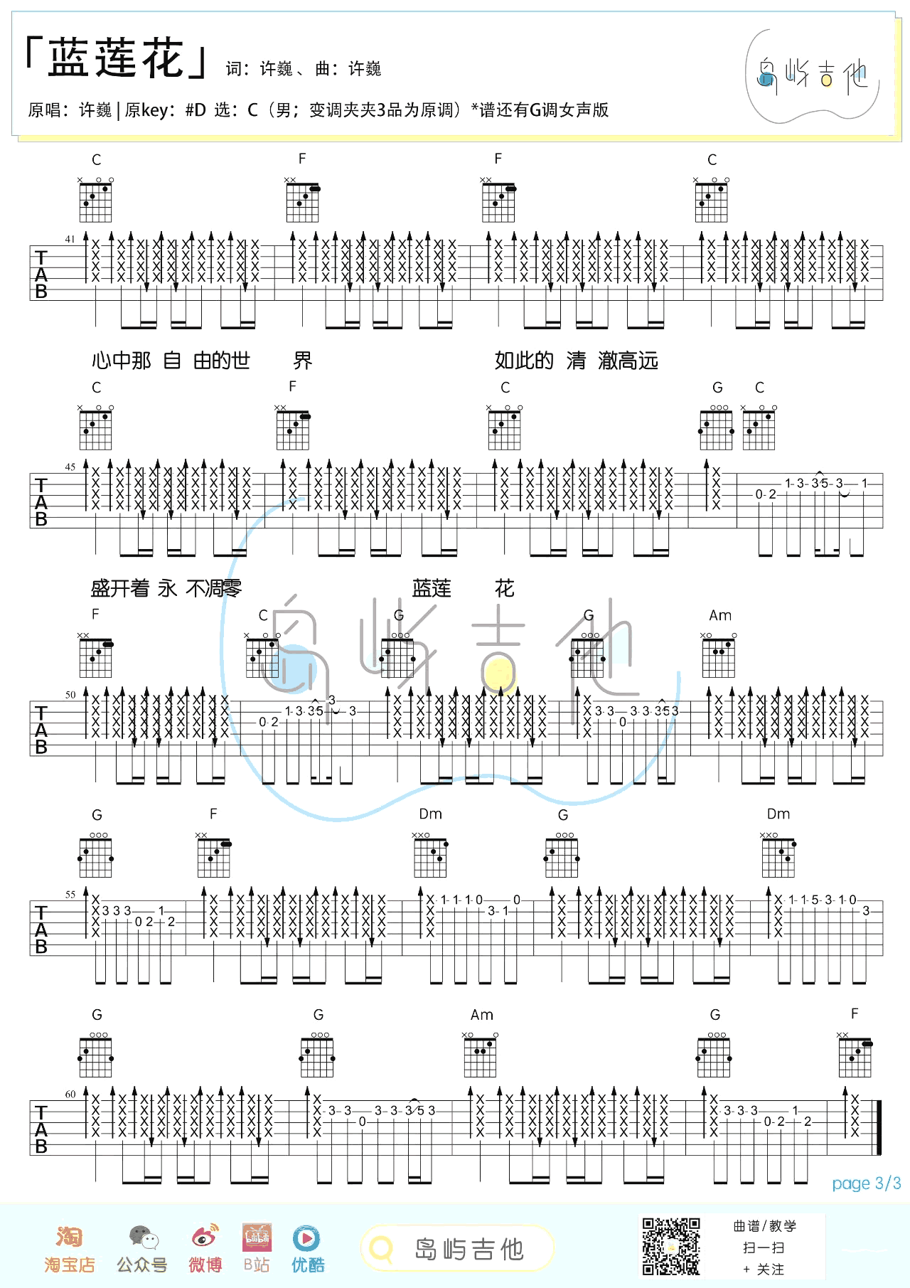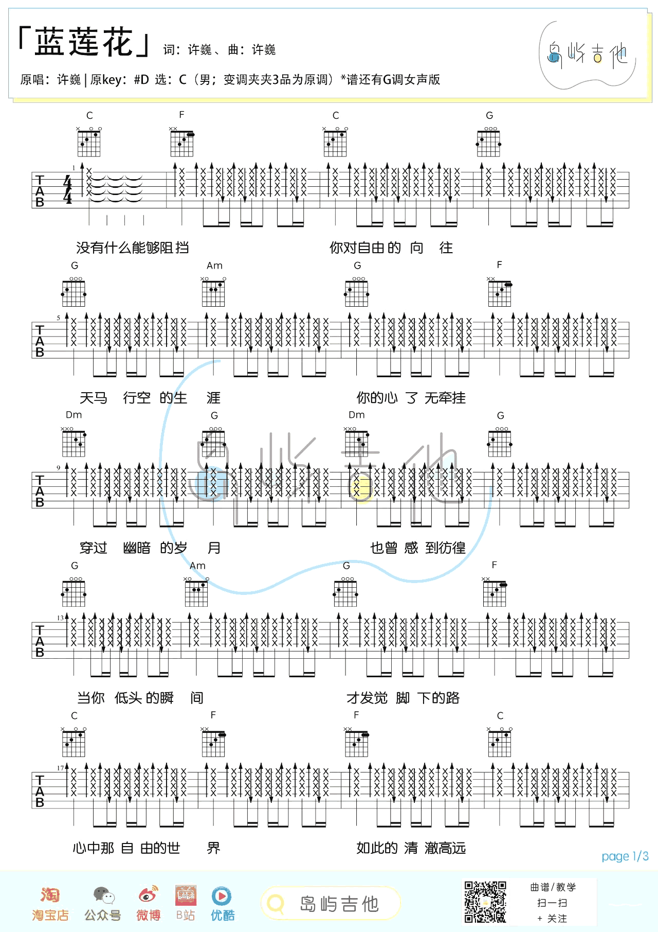 曲谱介绍: 许巍的一首经典代表歌曲,没有昂扬的旋律,却如此激励人心。蓝莲花吉他谱,原调升D,选用C调,男生版本变调夹夹三品为原调,三张弹唱图片谱。这首歌曲不仅仅属于许巍,也属于从中感受到找到共鸣的每一个人,那些穿过幽暗岁月、感到过无助彷徨,但依然坚守清澈高远内心世界的人们。