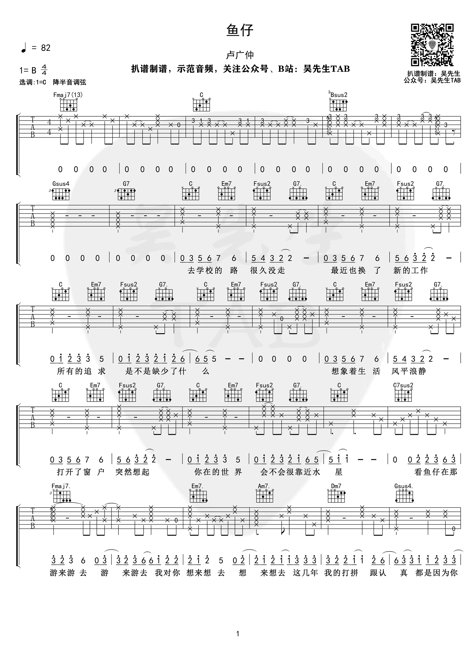 曲谱介绍: 鱼仔吉他谱,卢广仲词曲演唱,电视剧《花甲男孩转大人》主题曲,鱼仔六线谱,选用C调指法,降半音调弦,三张高清图片谱。每次听到主歌旋律时,就会令人安心;当进副歌歌词时,却感到漫漫的思念与鼻酸。希望你也能喜欢!
