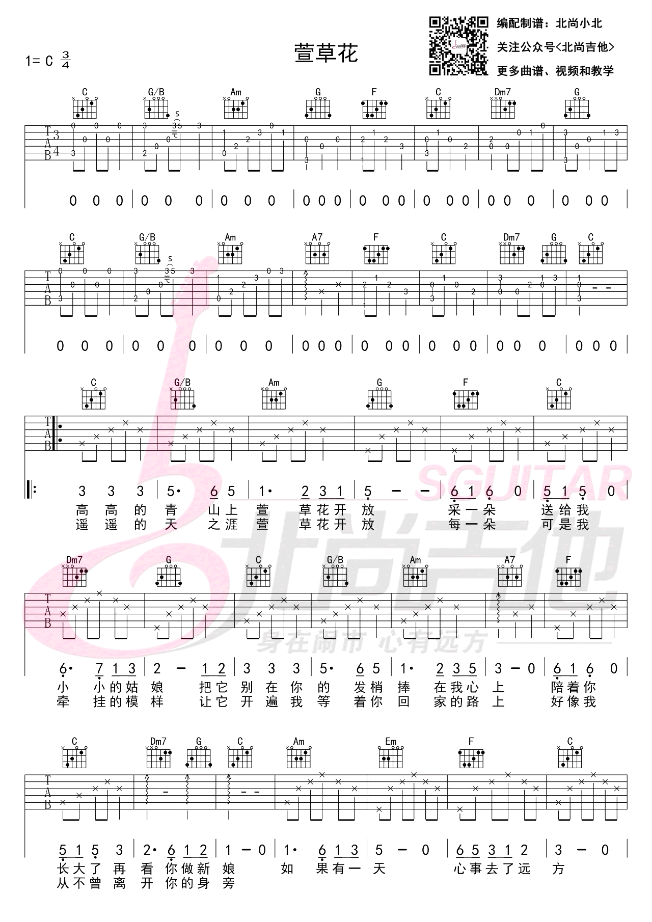 曲谱介绍: 张小斐《萱草花》吉他弹唱谱,采用C调指法编配,共有2张高清图谱,免翻页排版设计。