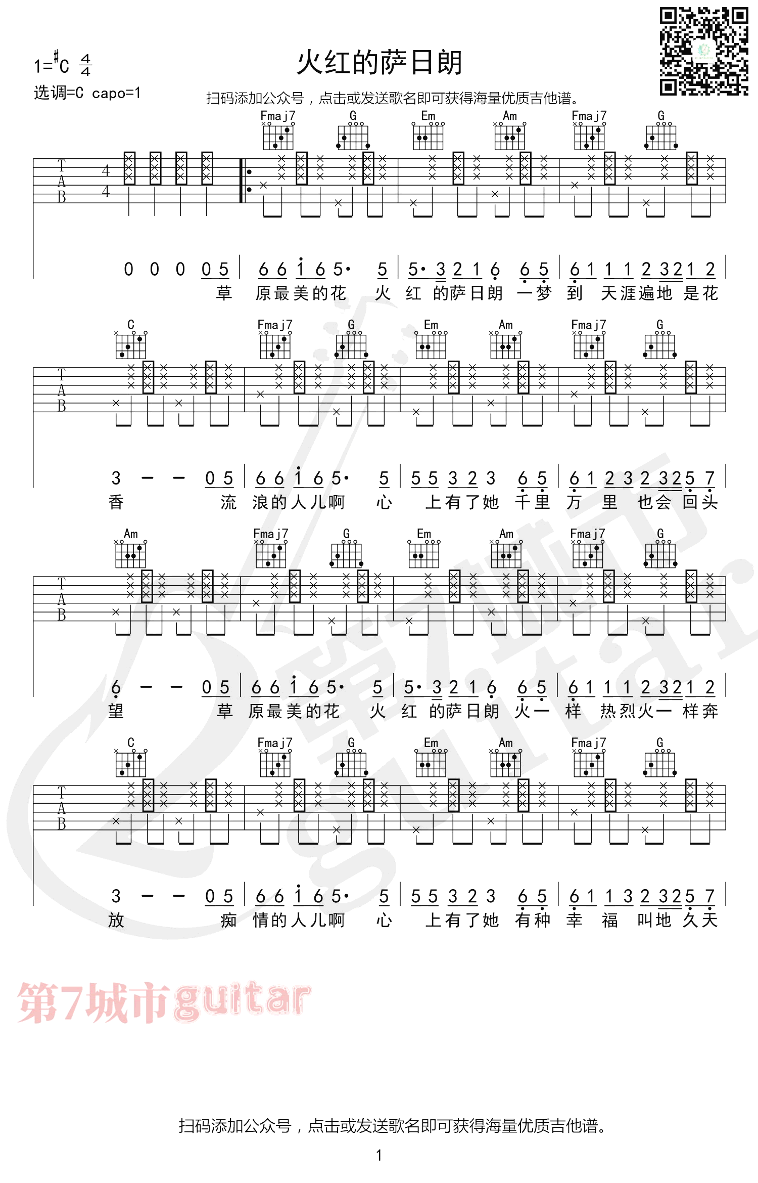 曲谱介绍: 火红的萨日朗吉他谱,要不要买菜的一首网络热门歌曲,原调升C选调C,CAPO夹一品,火红的萨日朗六线谱,简单版编配,两张弹唱图片谱。歌声清新欢快,草原民族风融入现代流行音乐元素,掀起一轮传唱风暴,成为全民广场热舞风潮,不知道琴友们有没有被get到?