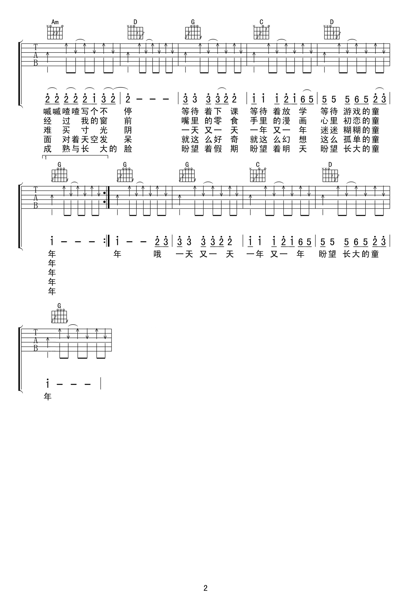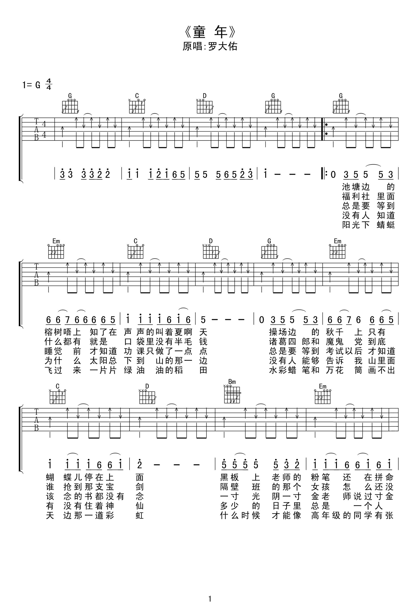 曲谱介绍: 罗大佑《童年》吉他弹唱谱,采用G调指法编配,共有2张高清图谱,免翻页排版设计。