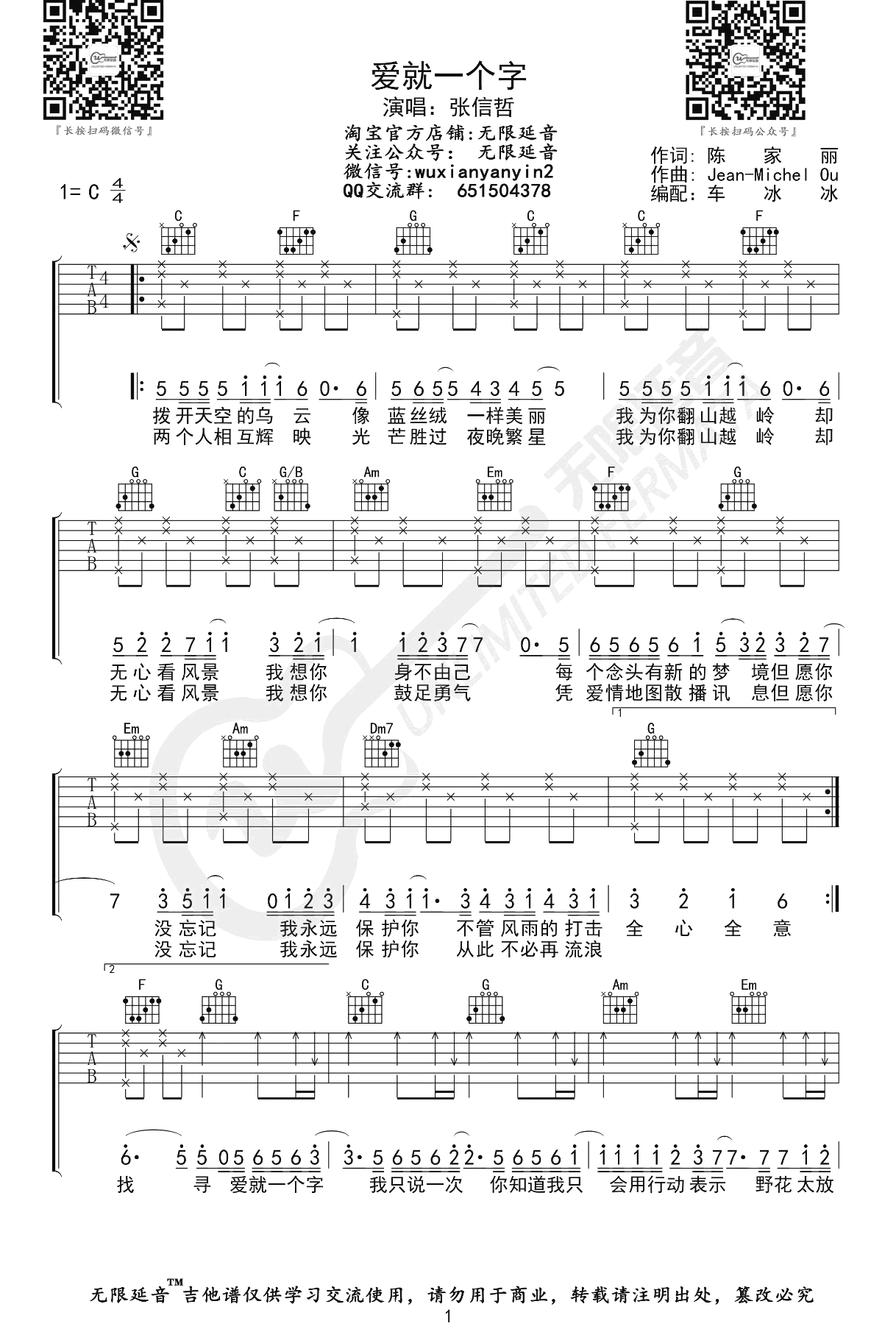 爱就一个字吉他谱 - 张信哲 - C调吉他弹唱谱
