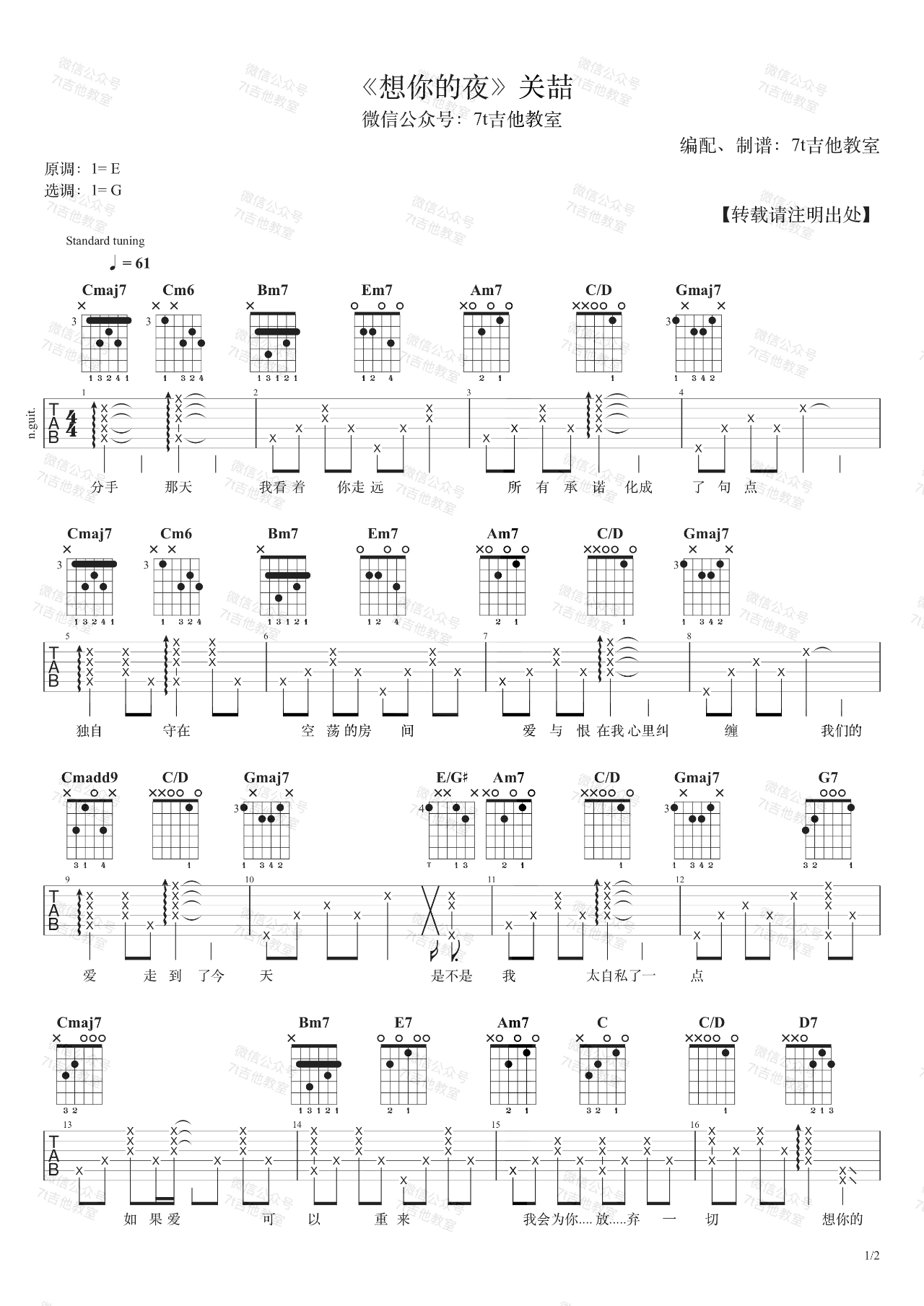 曲谱介绍: 《想你的夜》吉他谱,关喆的一首代表作品。想你的夜吉他弹唱谱,原调是E大调,用的是G大调的指法来编配,视频里是标准音调弦,没有使用变调夹。这个谱子不太适合弹原调,因为要夹太多品了……大家可以根据自己的音域把变调夹夹在适合自己的位置哦。