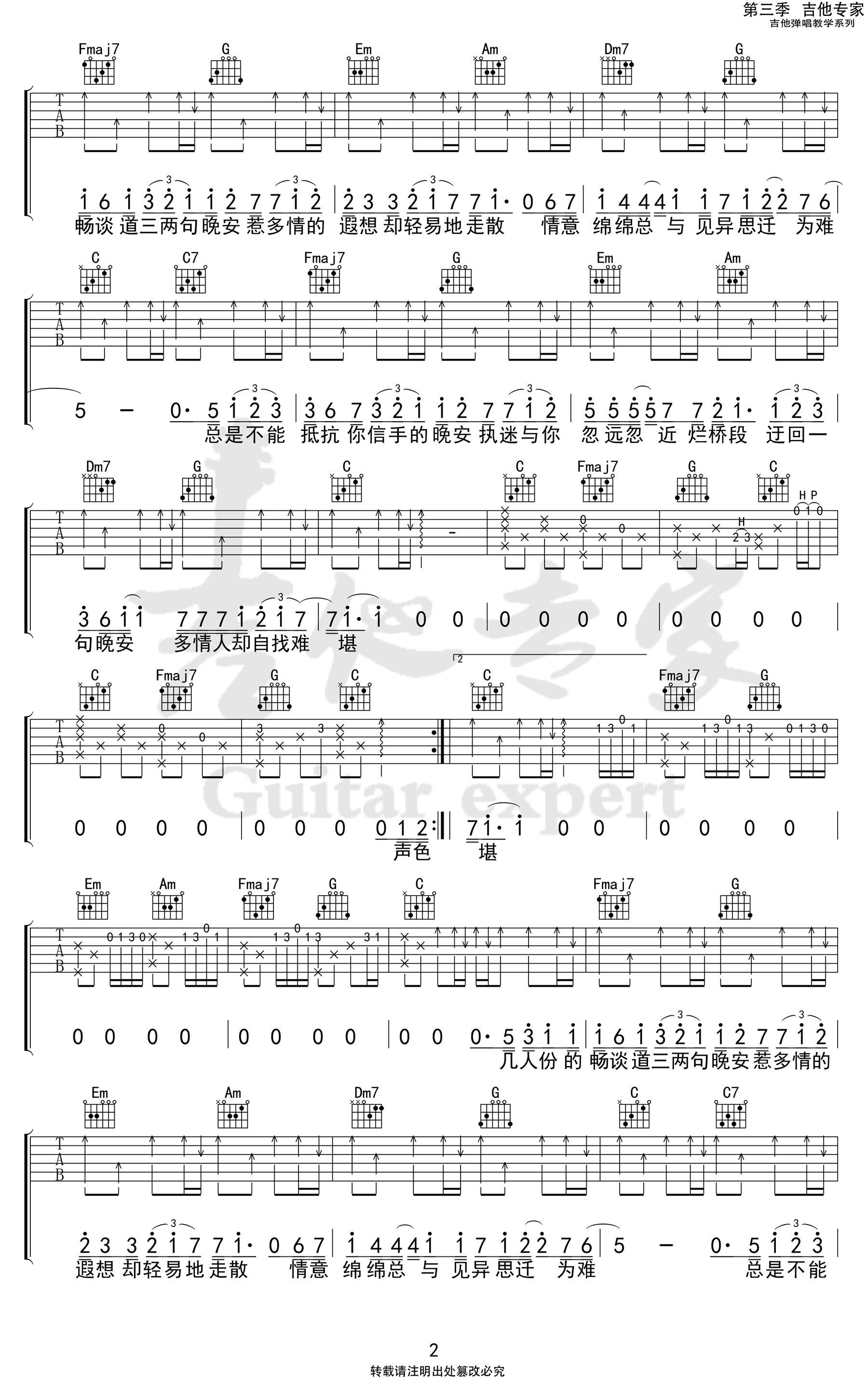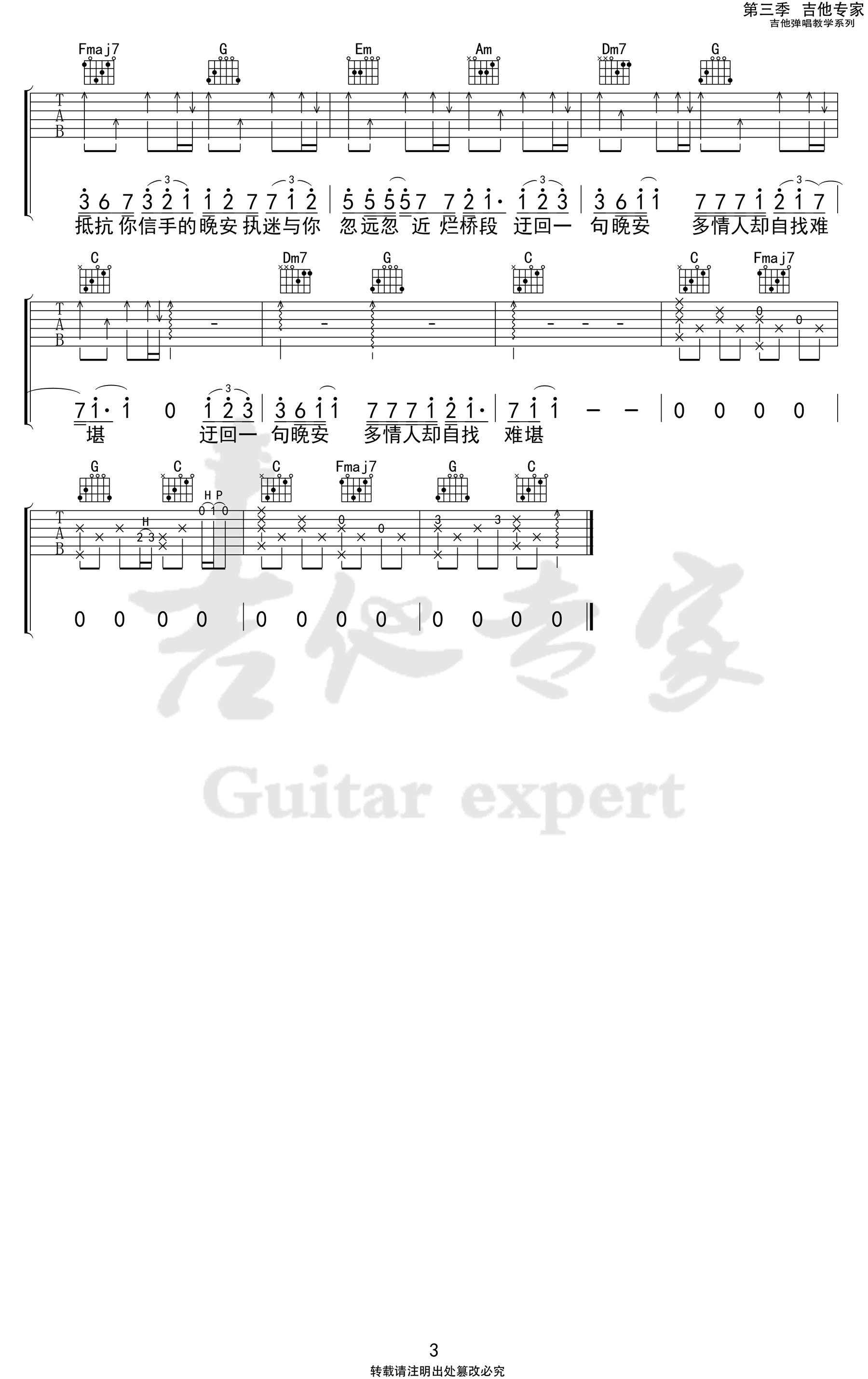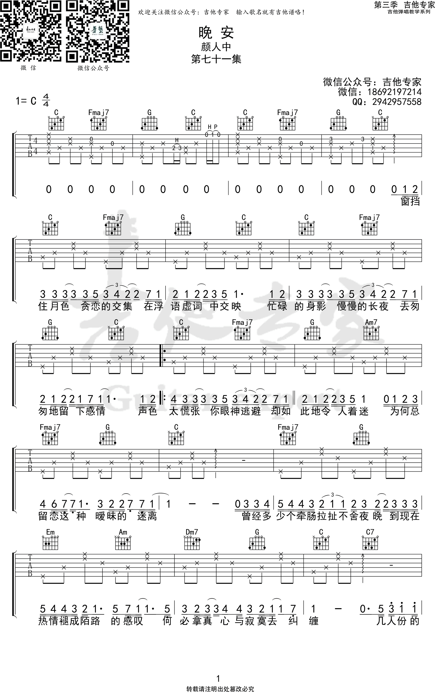 曲谱介绍: 颜人中《晚安》吉他弹唱谱,采用C调指法编配,共有3张高清图谱。