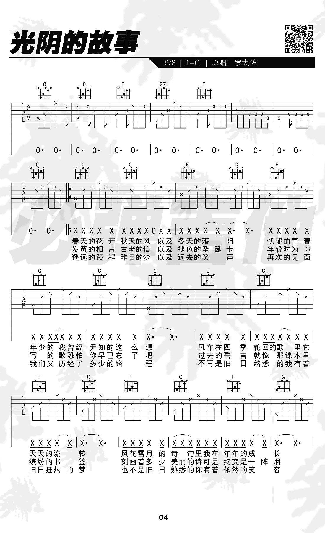 曲谱介绍: 罗大佑《光阴的故事》吉他弹唱谱,采用C调指法编配,共有2张高清图谱,免翻页排版设计。