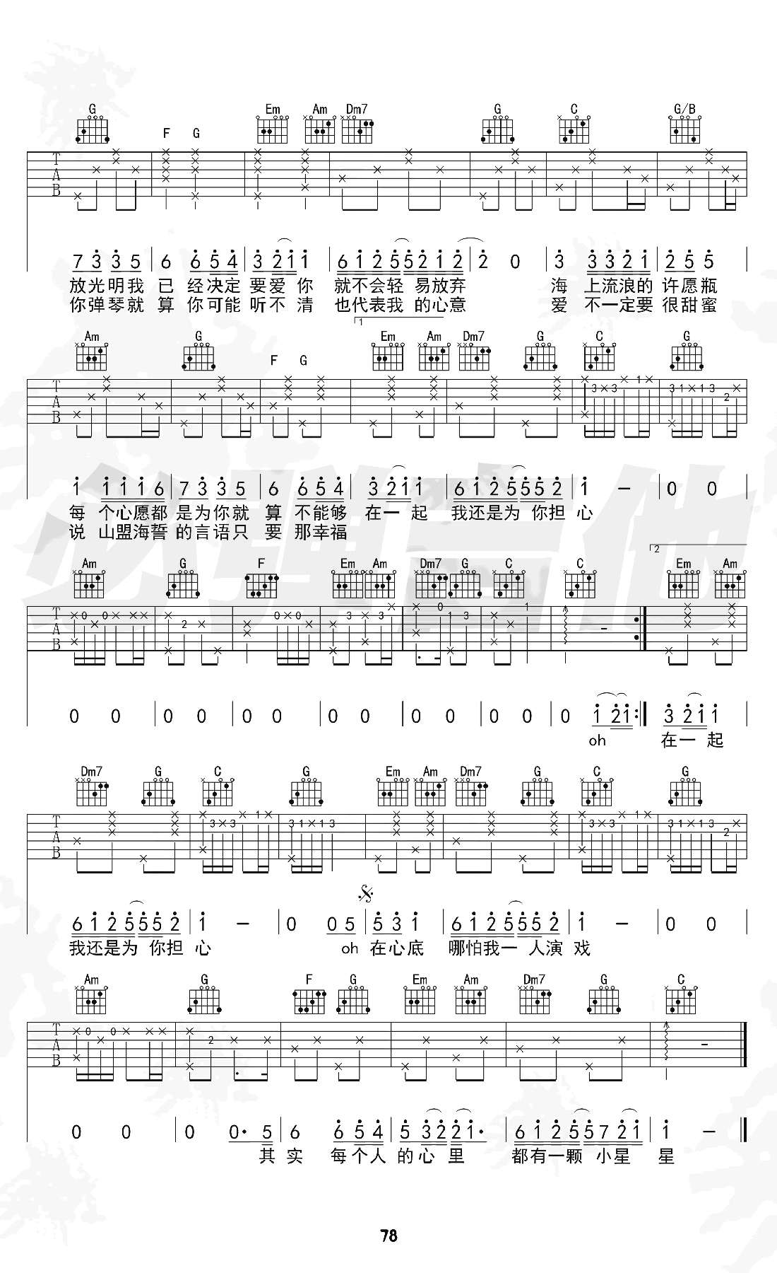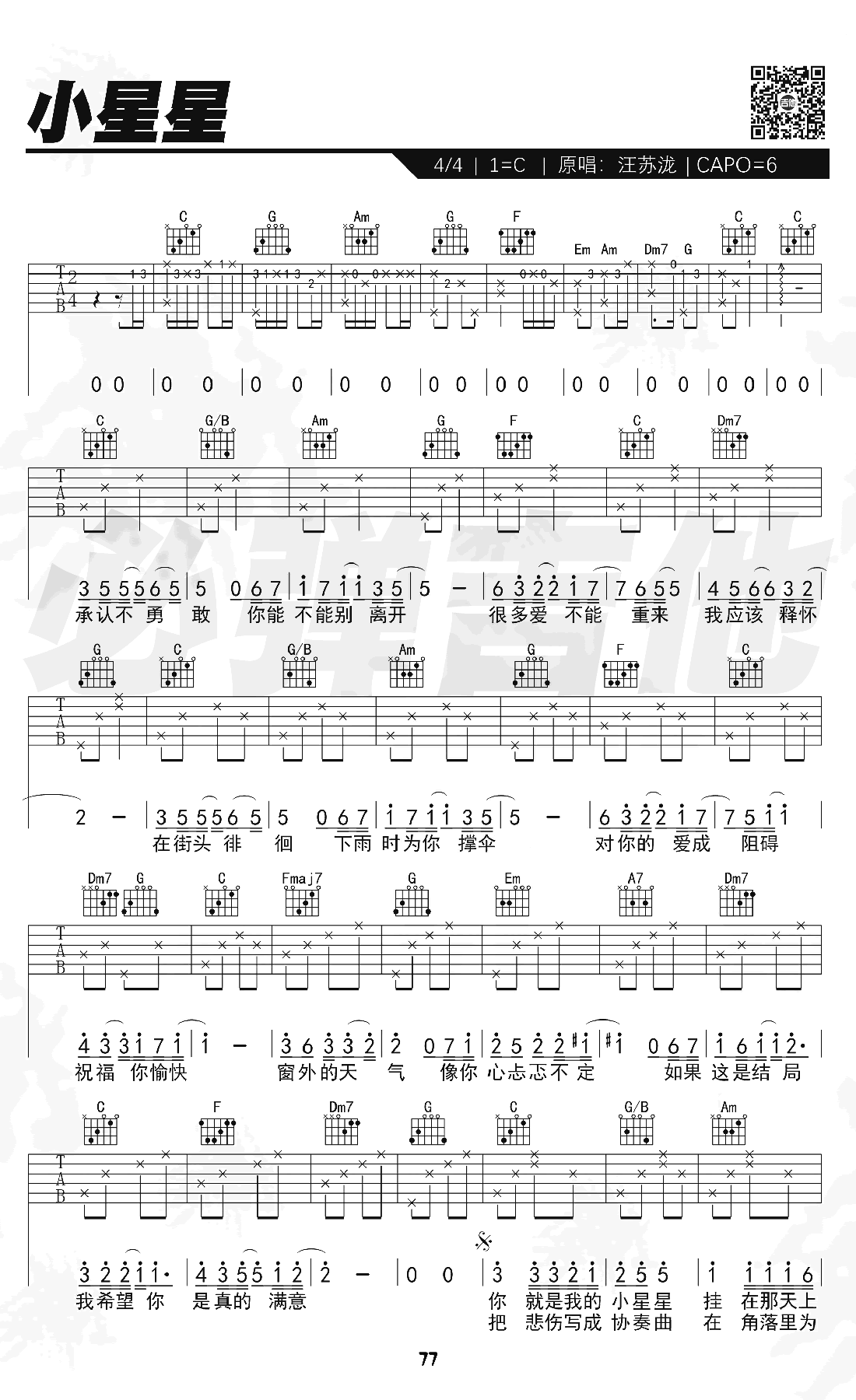 曲谱介绍: 小星星吉他谱,汪苏泷演唱的一首经典代表歌曲,小星星六线谱,原调C,CAPO夹六品,两张弹唱图片谱。每个人心中都一颗有属于自己的小星星,温柔的弹唱,承载了多少90后的回忆,相信这首歌会带给你我抚慰和光明。