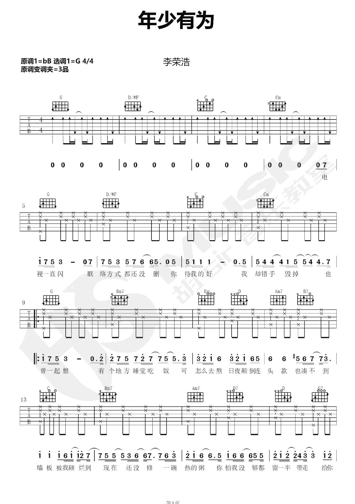 曲谱介绍: 李荣浩《年少有为》吉他谱,原调降B,选调G,变调夹夹三品。年少有为六线谱,两张弹唱图片谱。人生没有如果,错过终成遗憾,叙事感的低音嗓,走心又带感的歌词旋律,唱出青春的耿耿于怀,也唱尽每个人心里的失去的遗憾与追悔。