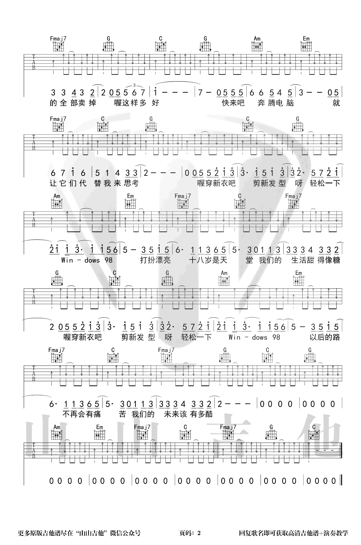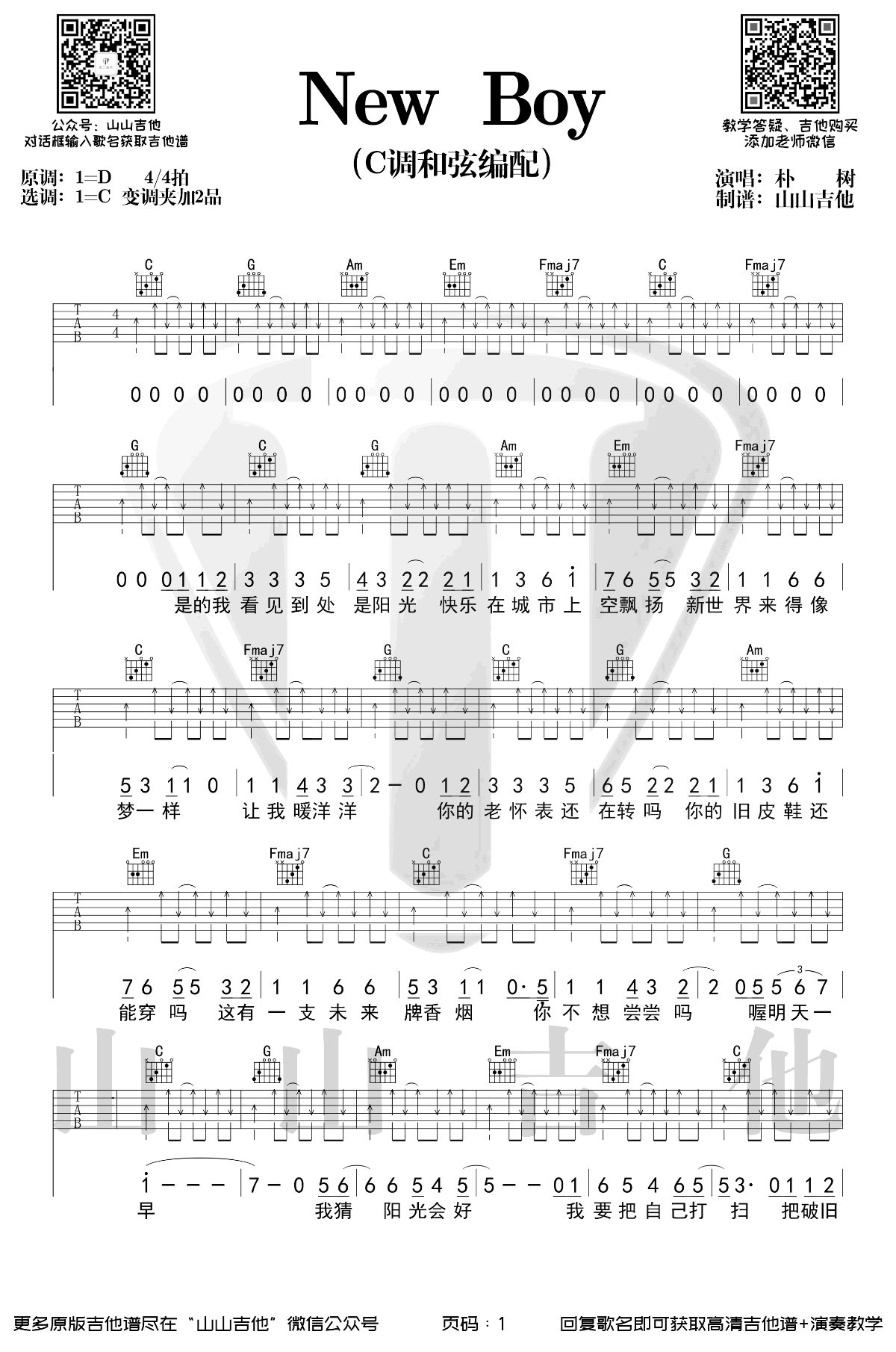 曲谱介绍: 一首《乐队的夏天》中出现过的歌,朴树的经典老歌《New Boy》吉他谱,原调D选调C,变调夹夹第二品,两张弹唱图片谱。