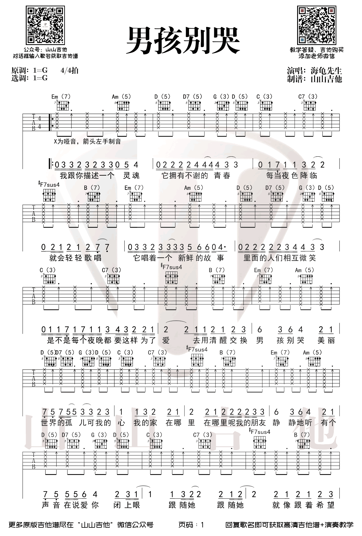 男孩别哭吉他谱 - 海龟先生 - G调吉他弹唱谱