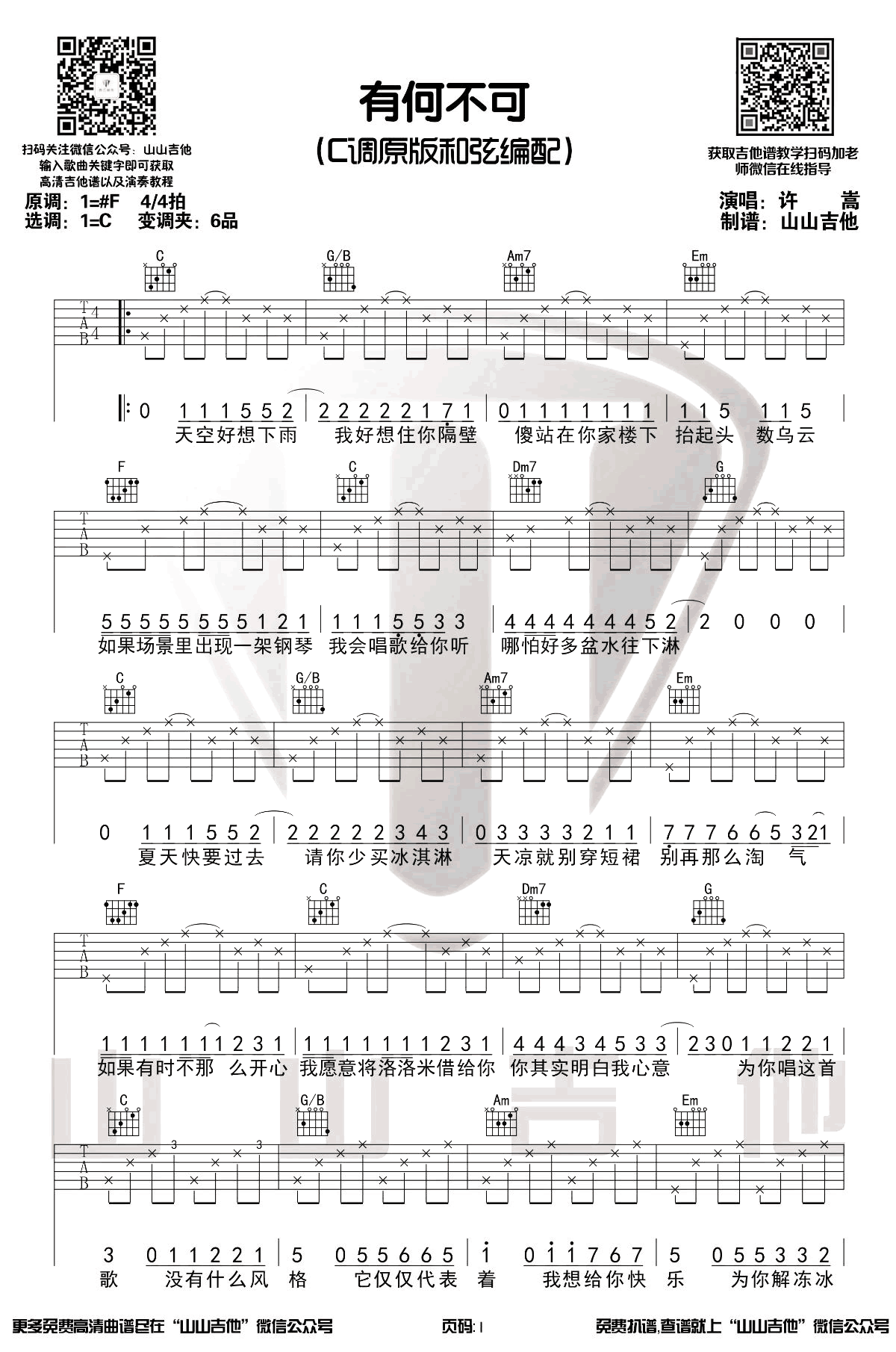 曲谱介绍: 有何不可吉他谱,许嵩的一首老歌,原调升F选调C,变调夹夹六品。有何不可六线谱,三张弹唱图片谱。