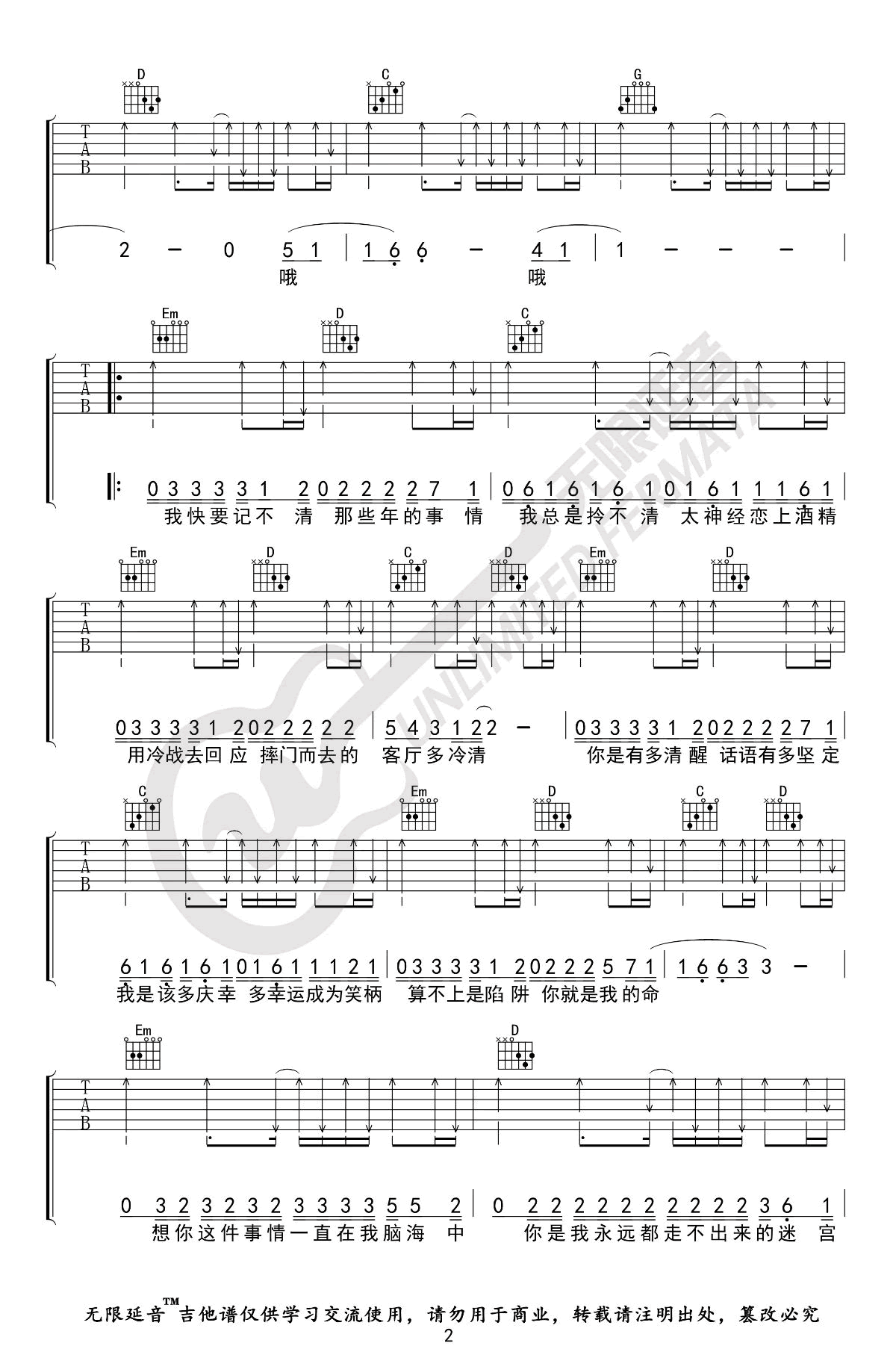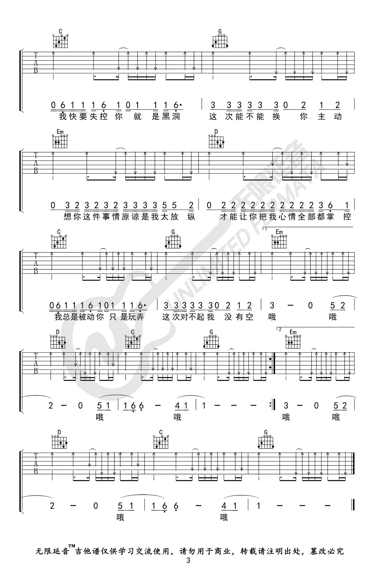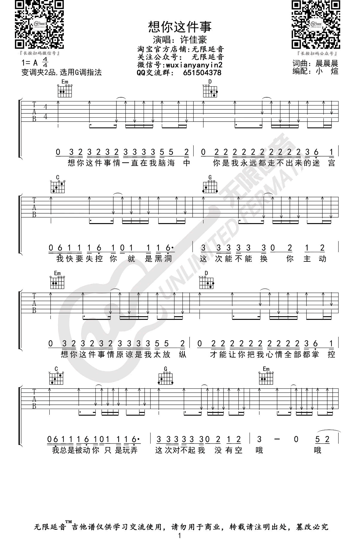 曲谱介绍: 许佳豪《想你这件事》吉他谱,原调A选用G调指法,变调夹二品。想你这件事六线谱,三张弹唱图片谱。