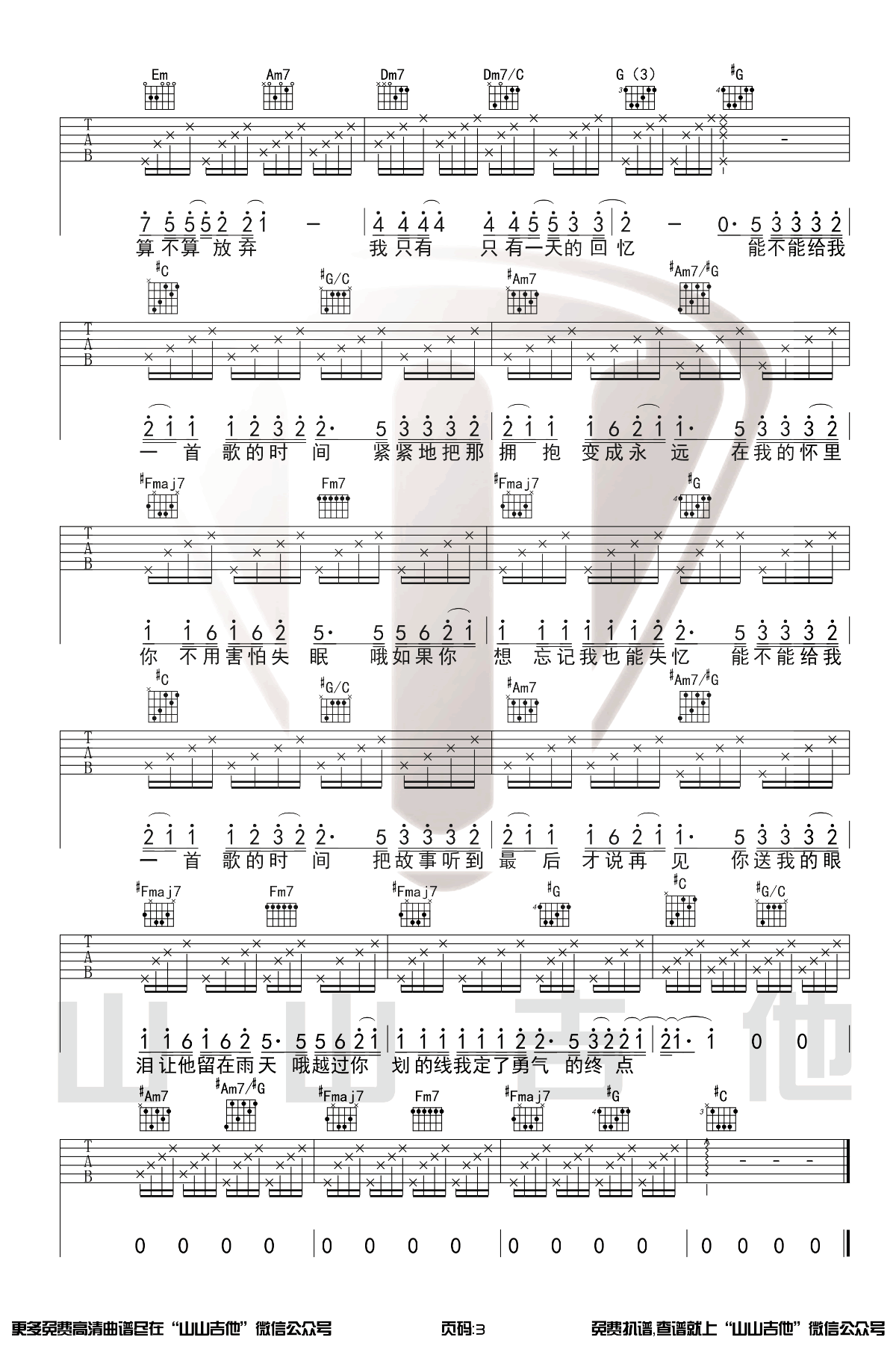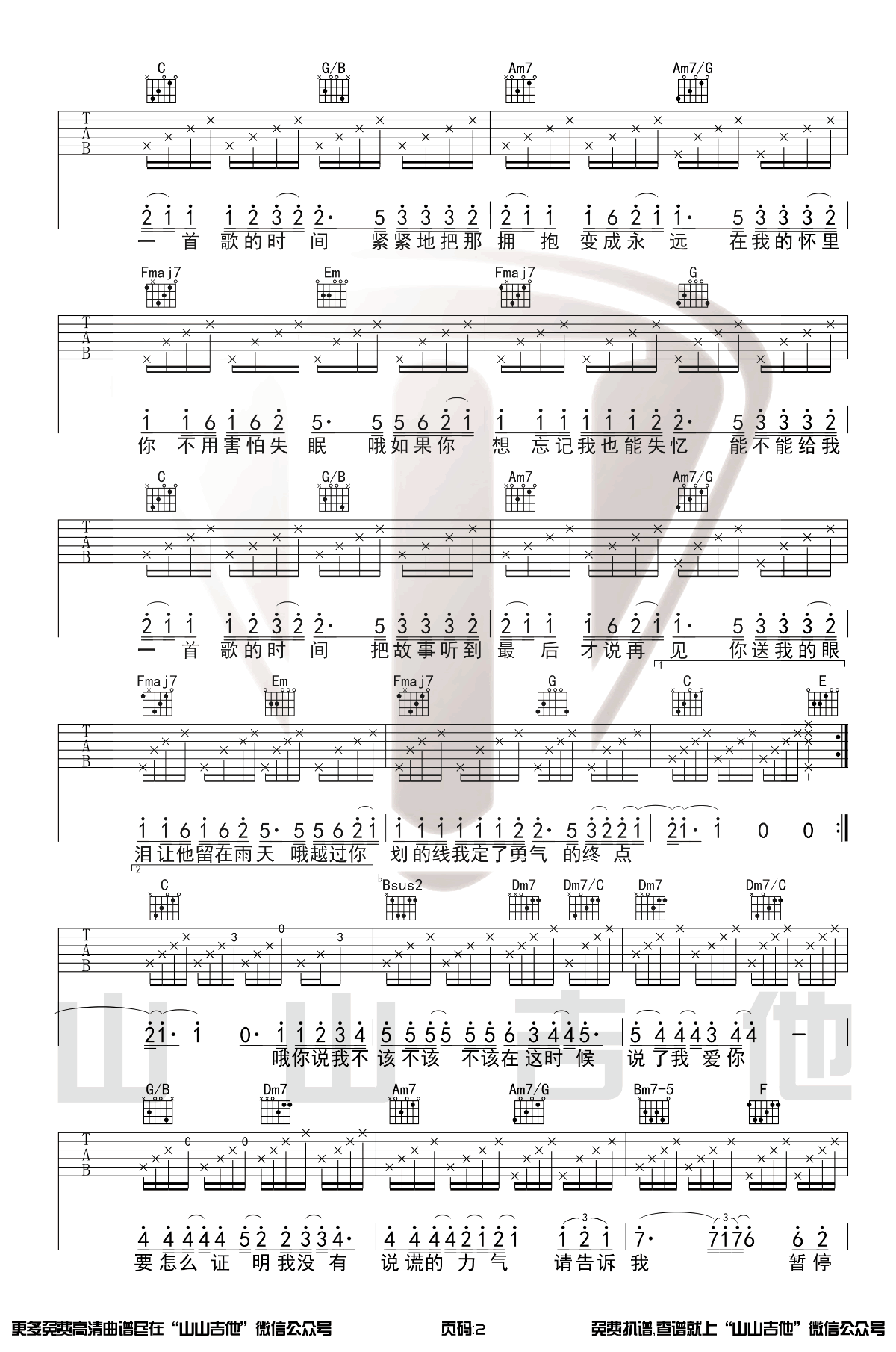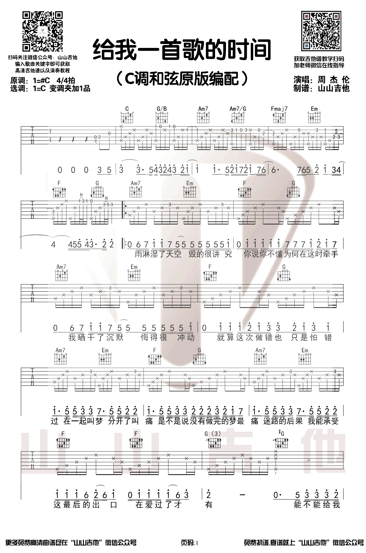 曲谱介绍: 周杰伦的一首经典虐心情歌,给我一首歌的时间吉他谱,原调升C,选用C调和弦原版编配,变调夹加一品,三张图片六线谱。
