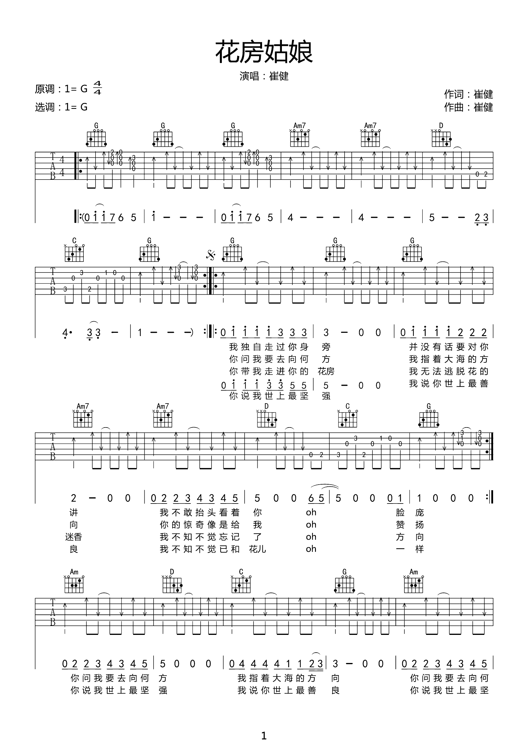 曲谱介绍: 崔健《花房姑娘》吉他弹唱谱,采用G调指法编配,共有2张高清图谱,免翻页排版设计。