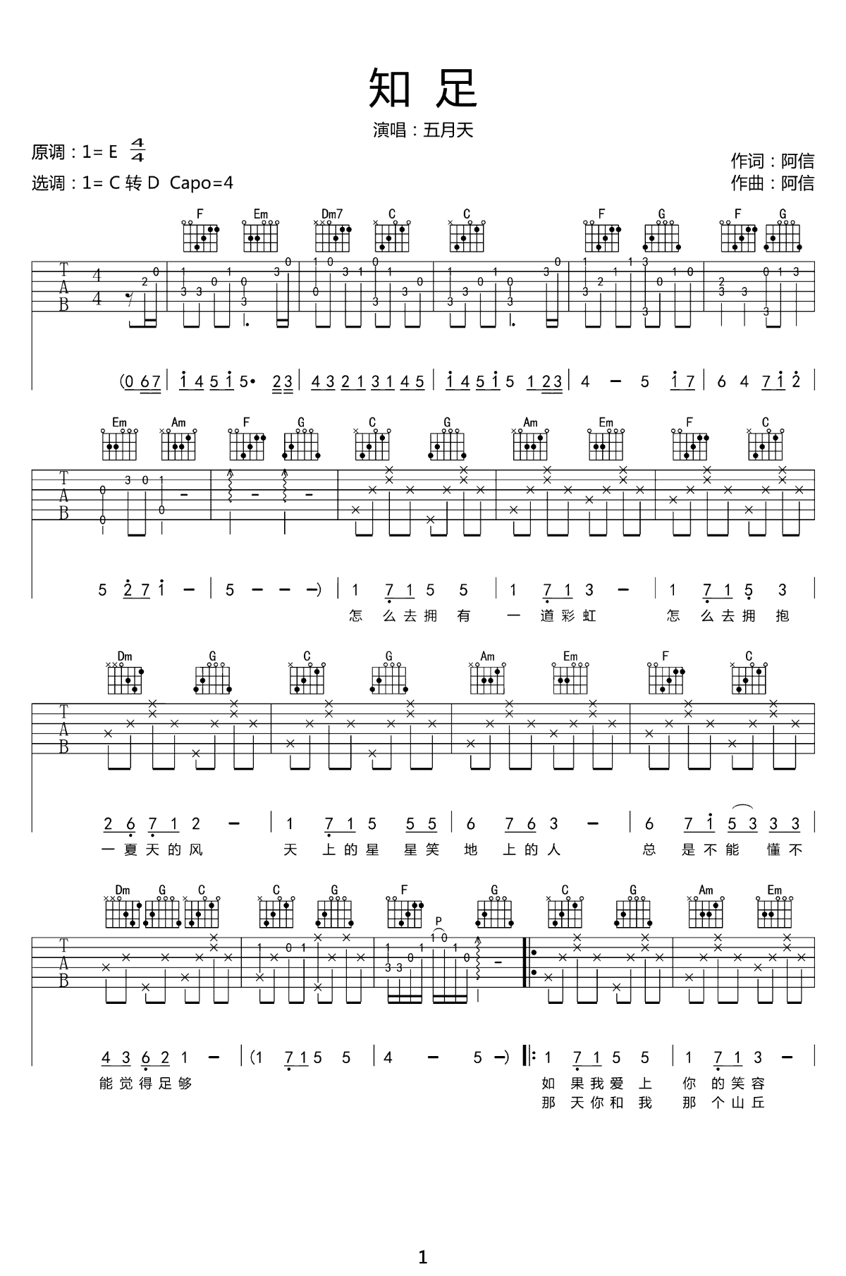 知足吉他谱 - 五月天 - C调吉他弹唱谱