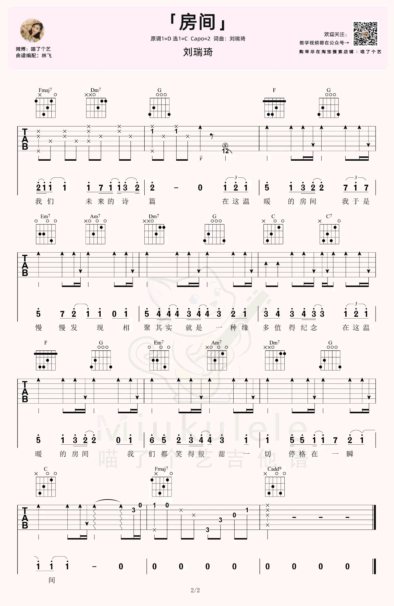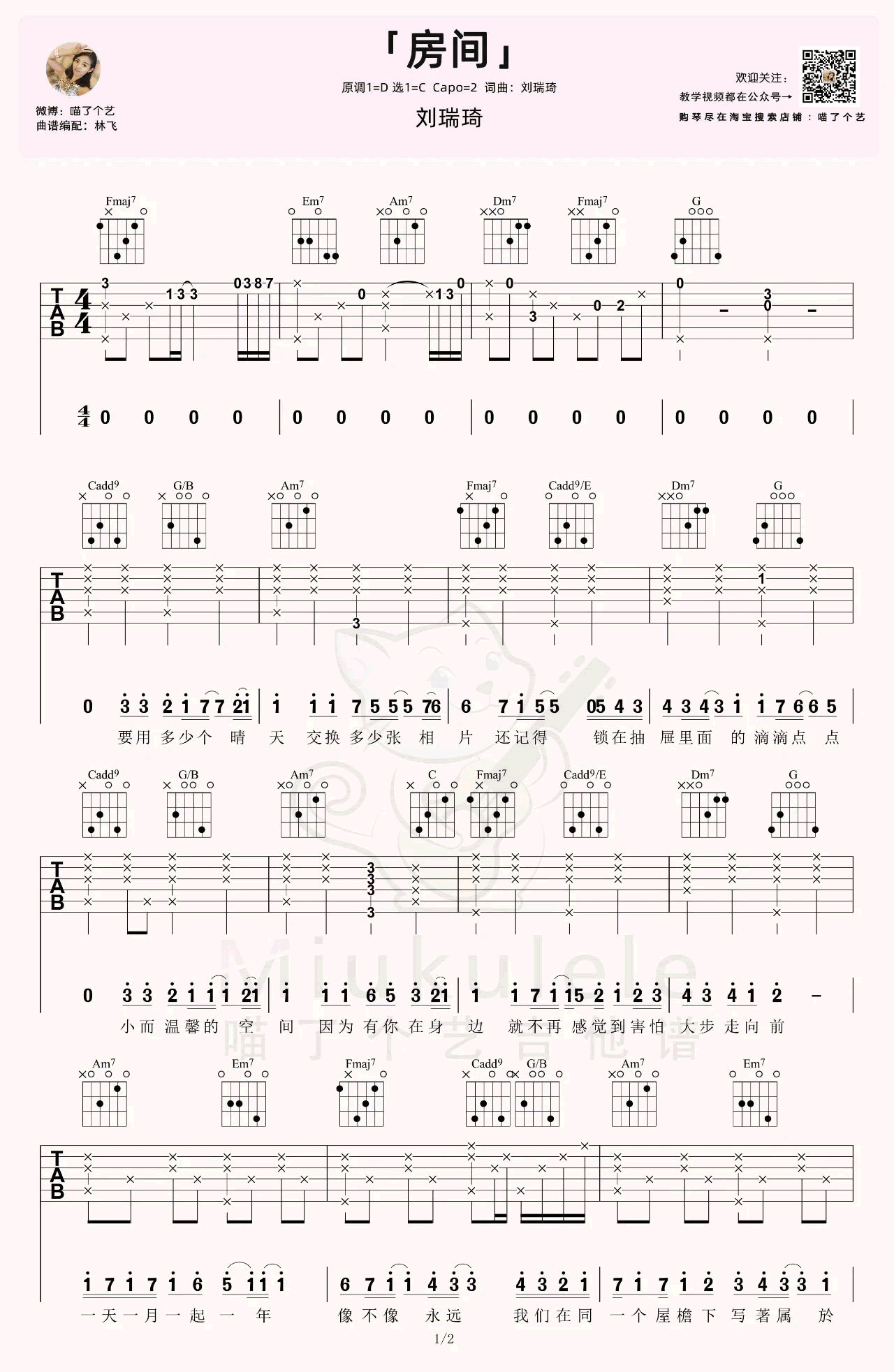 曲谱介绍: 刘瑞琦的一首原创歌曲,房间吉他谱,原调D选调C,CAPO夹二品,两张弹唱图片谱。这首打动人心的歌无关于爱情,而是关于友情。相聚就是一种缘分,感谢你们在我身边陪我那么久。[要用多少个晴天,交换多少张相片,还记得锁在抽屉里面的滴滴点点],这首歌用吉他弹唱好像一下子就对味了,而且难度也不高,加油。