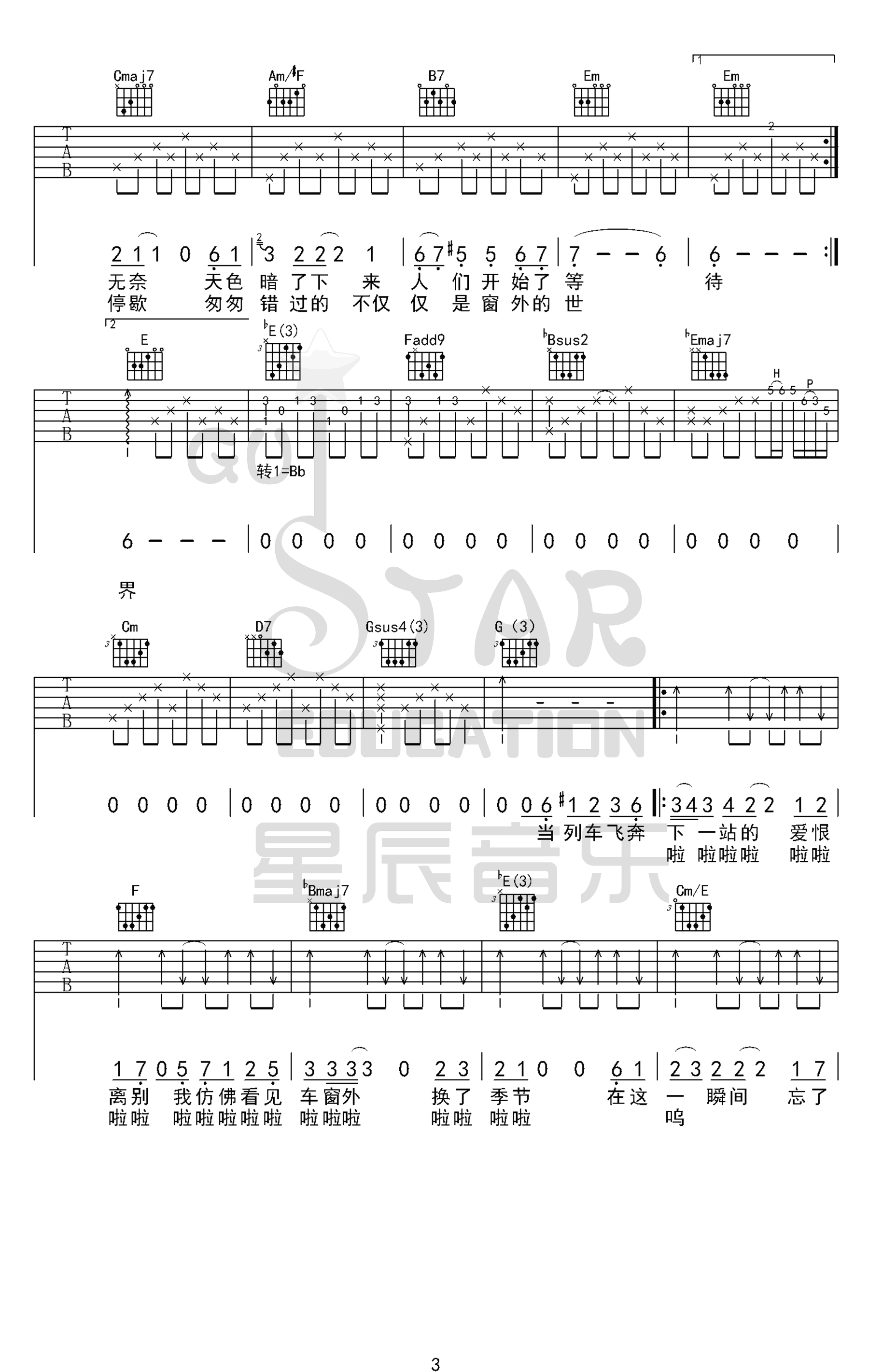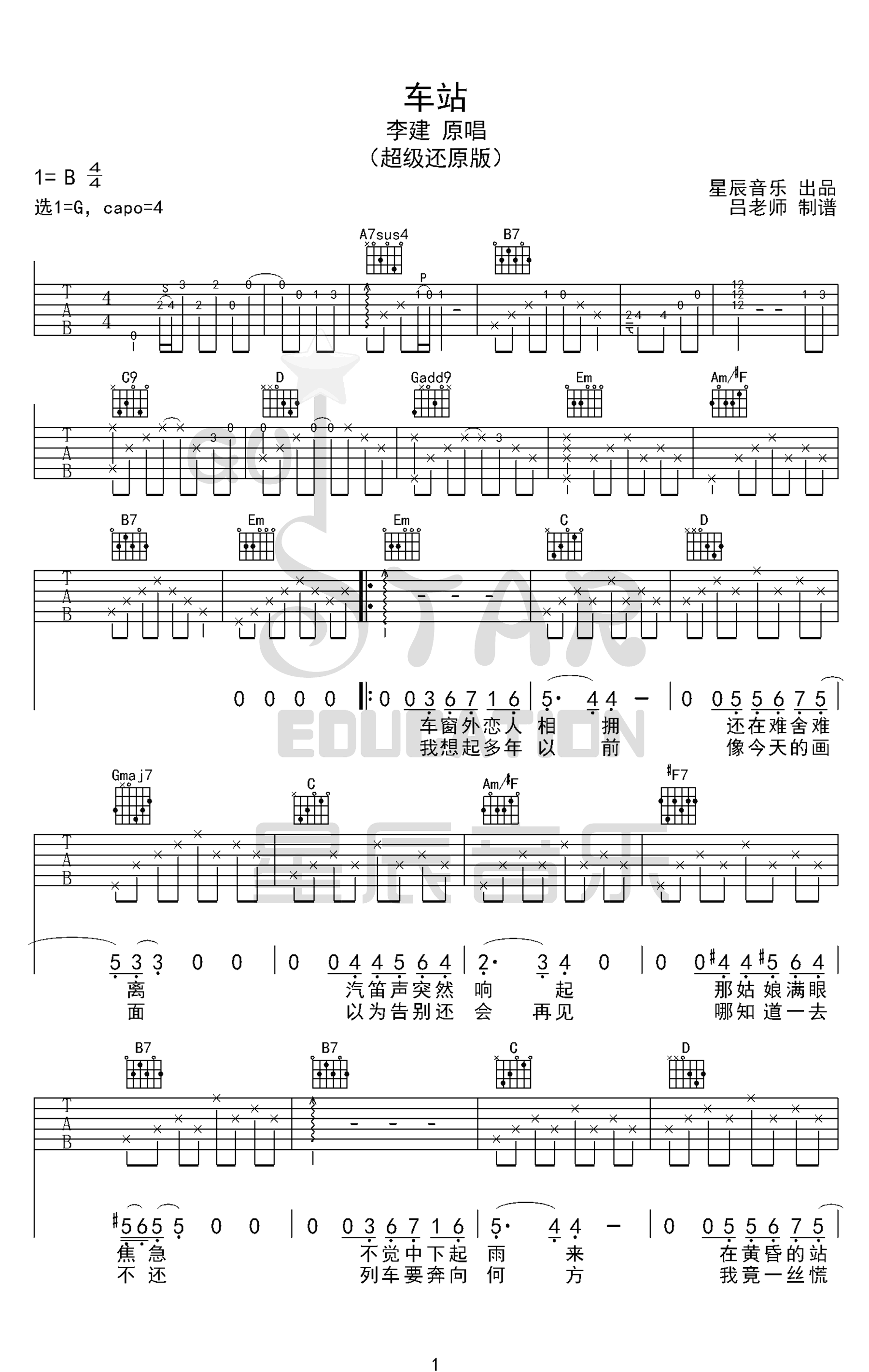 曲谱介绍: 李健《我是歌手》节目,翻唱改编自日本女歌手竹内玛莉亚的《駅》,车站吉他谱,原调B选调G,CAPO夹四品,超级还原版编配,共四张高清图片谱。经典歌曲悠扬的旋律,带给人无尽的人生百味。每个人的车站都有着属于自己的故事,你的车站又为谁送别和停留?