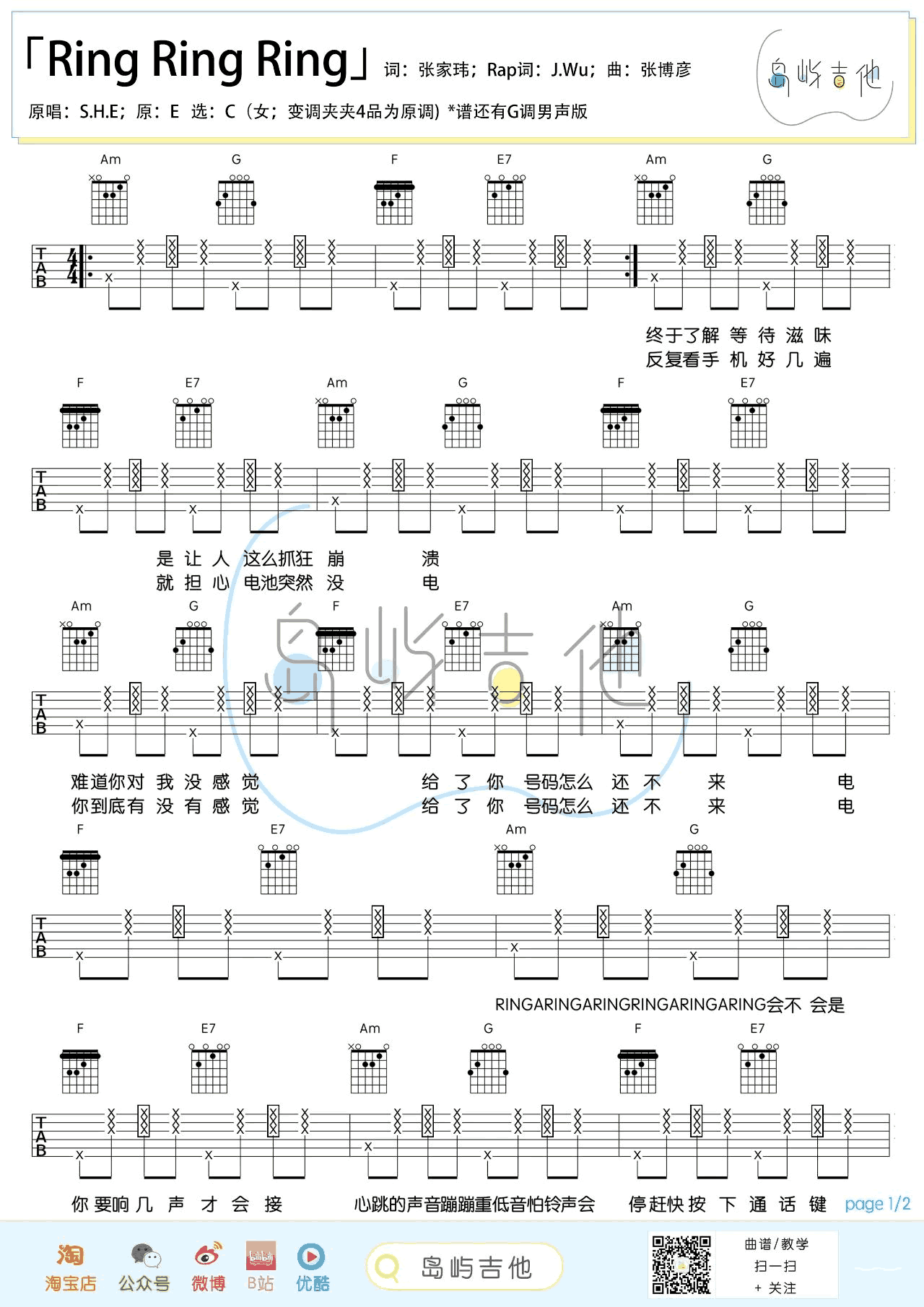 曲谱介绍: 《Ring Ring Ring》吉他谱,S.H.E演唱的一首老歌最近在网络重新翻红,原调E选调C,女生调版本,变调夹夹第四品。曾经火遍大街小巷,将少女情窦初开的羞涩和悸动完美诠释,不论听几遍,都是让人想恋爱的冲动。同步附上《Ring Ring Ring》吉他弹唱教学视频,同学们跟随尼克猫老师带来的教学示范练习。