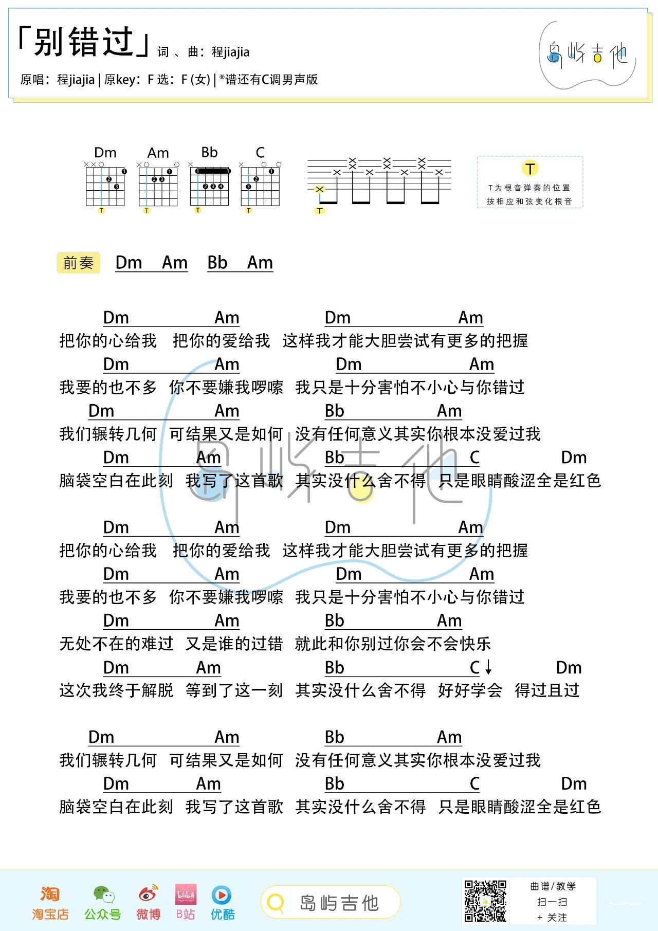 曲谱介绍: 程jiajia《别错过》吉他弹唱谱,共有2张高清图谱,免翻页排版设计。