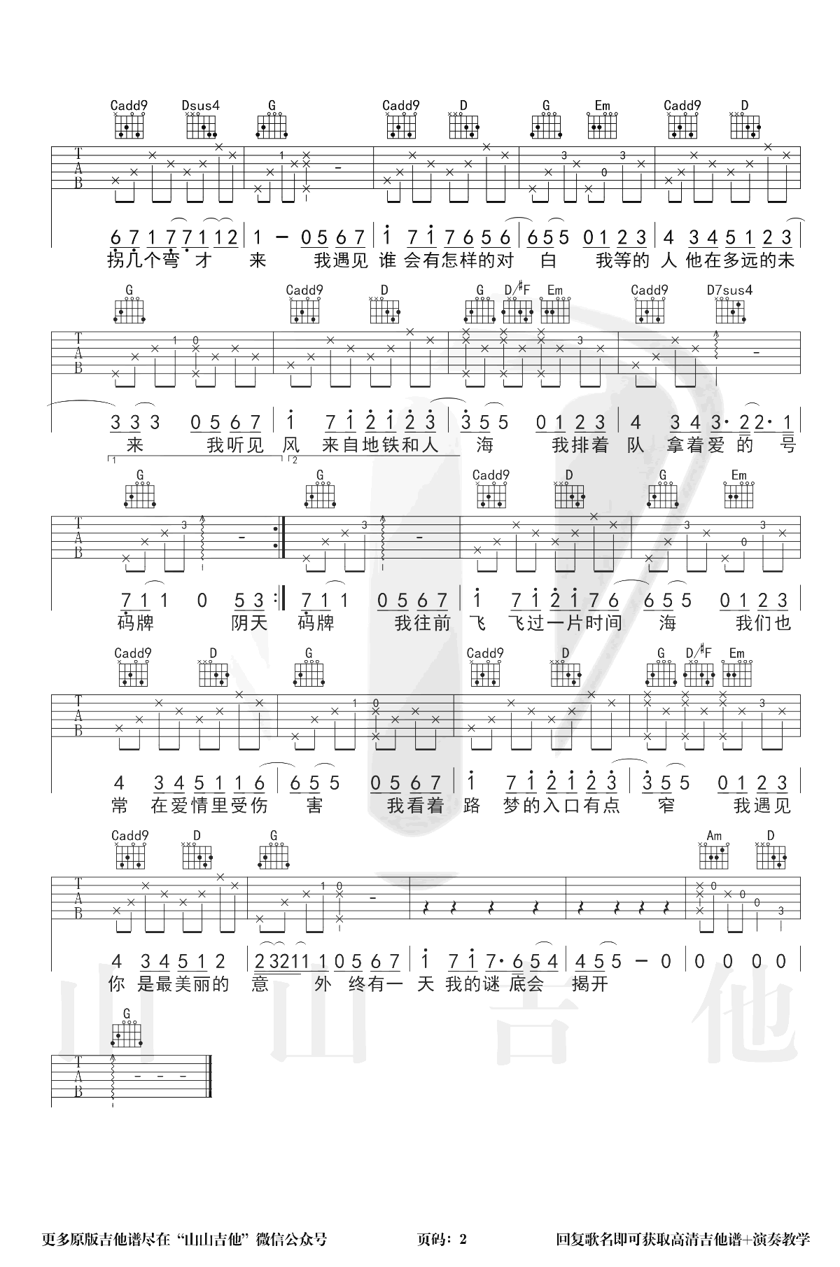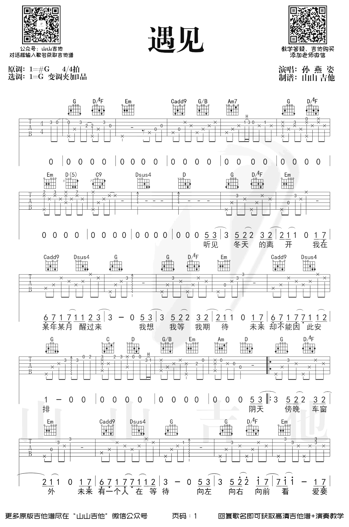 曲谱介绍: 孙燕姿最有影响力的代表作品,电影《向左走,向右走》主题曲。《遇见》吉他谱,G调指法,变调夹夹一品,两张弹唱图片谱。