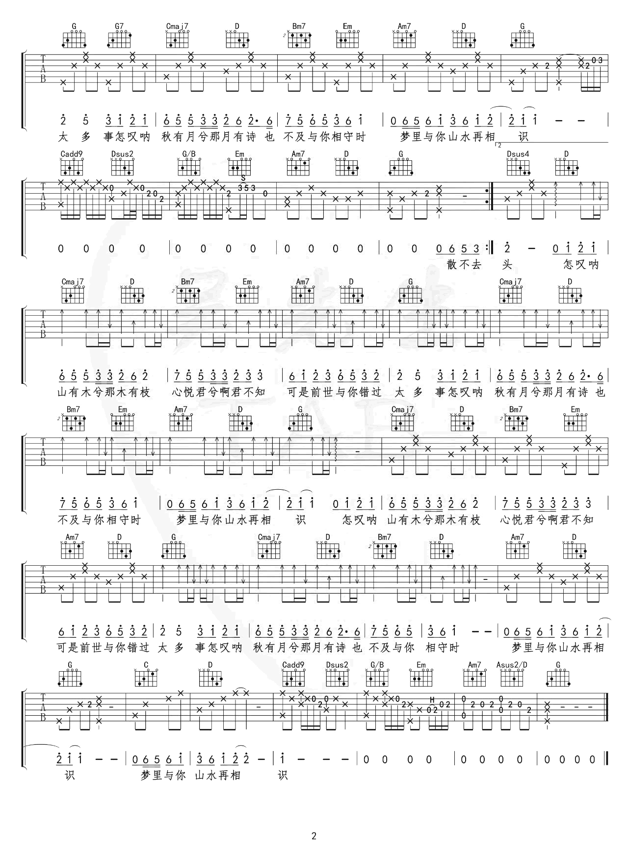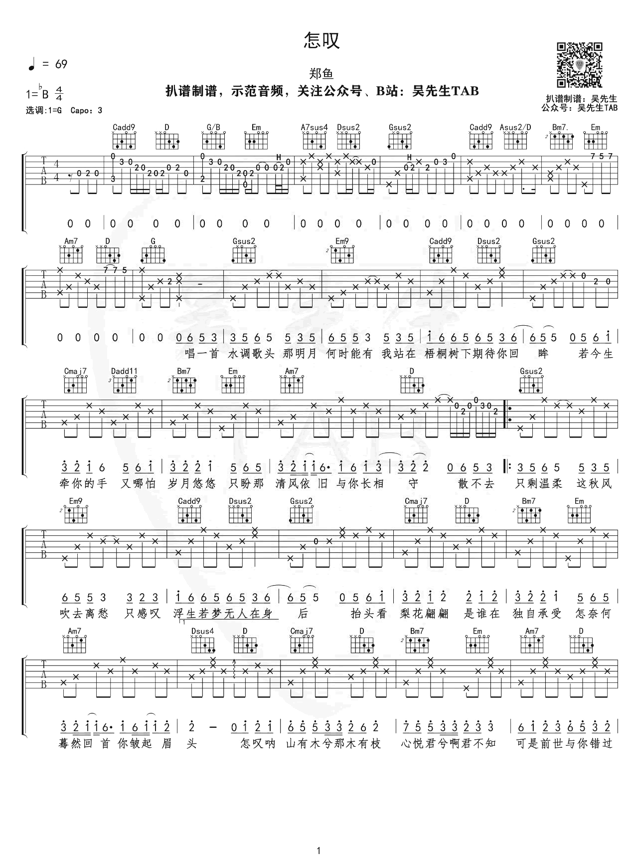 曲谱介绍: 郑鱼演唱的一首古风歌曲,怎叹吉他谱,原调降B选调G,CAPO夹三品。怎叹六线谱,两张图片谱例。