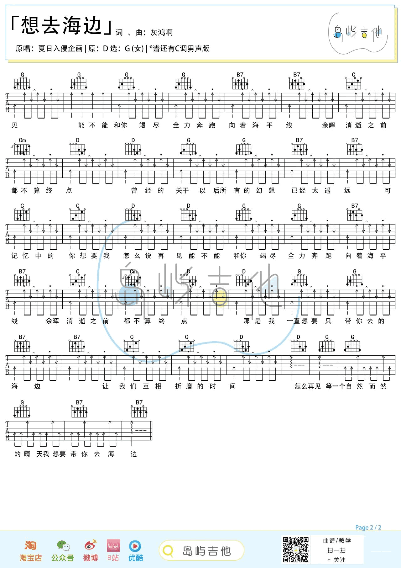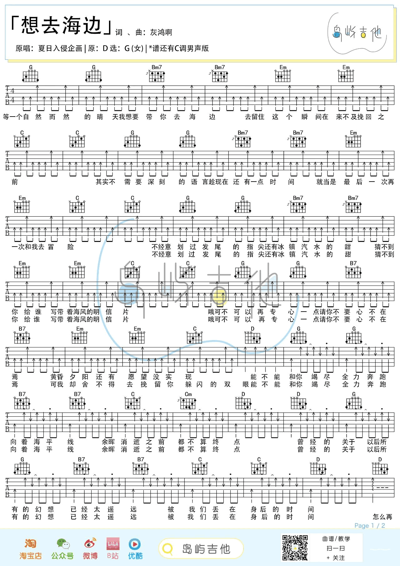 想去海边吉他谱 - 夏日入侵企画 - G调吉他弹唱谱