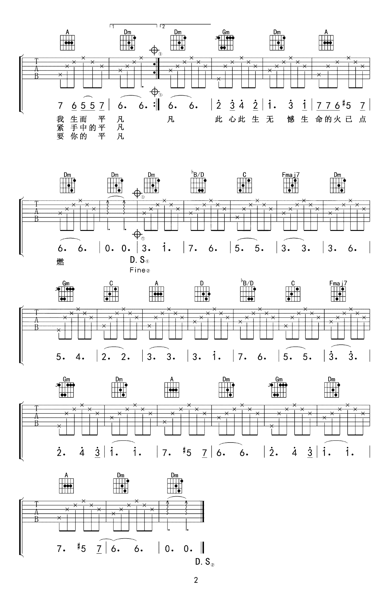 曲谱介绍: 张碧晨/张杰《只要平凡》吉他弹唱谱,采用F调指法编配,共有2张高清图谱,免翻页排版设计。