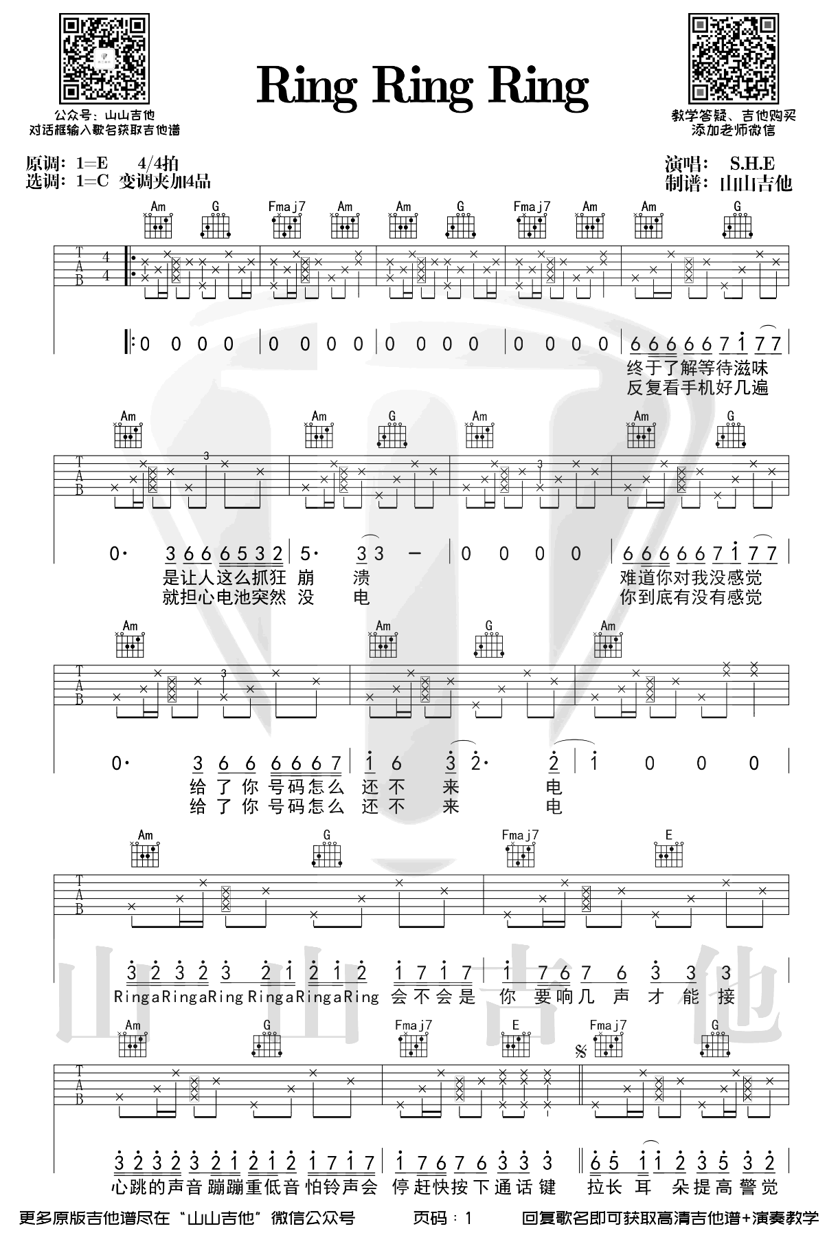 曲谱介绍: Ring Ring Ring吉他谱,S.H.E的一首老歌,重新翻红网络短视频平台。Ring Ring Ring吉他六线谱,原调E选调C,变调夹夹四品,两张弹唱图片谱。一首娇滴滴的小甜歌了,描述了当时年轻人用手机谈恋爱的现状。最近翻唱这首歌的人很多,不是花火呀小姐姐翻唱的版本还冲到了新歌榜首,甚至压过了原唱S.H.E!谱子和演奏示范视频送上,喜欢的同学赶紧练起来吧!