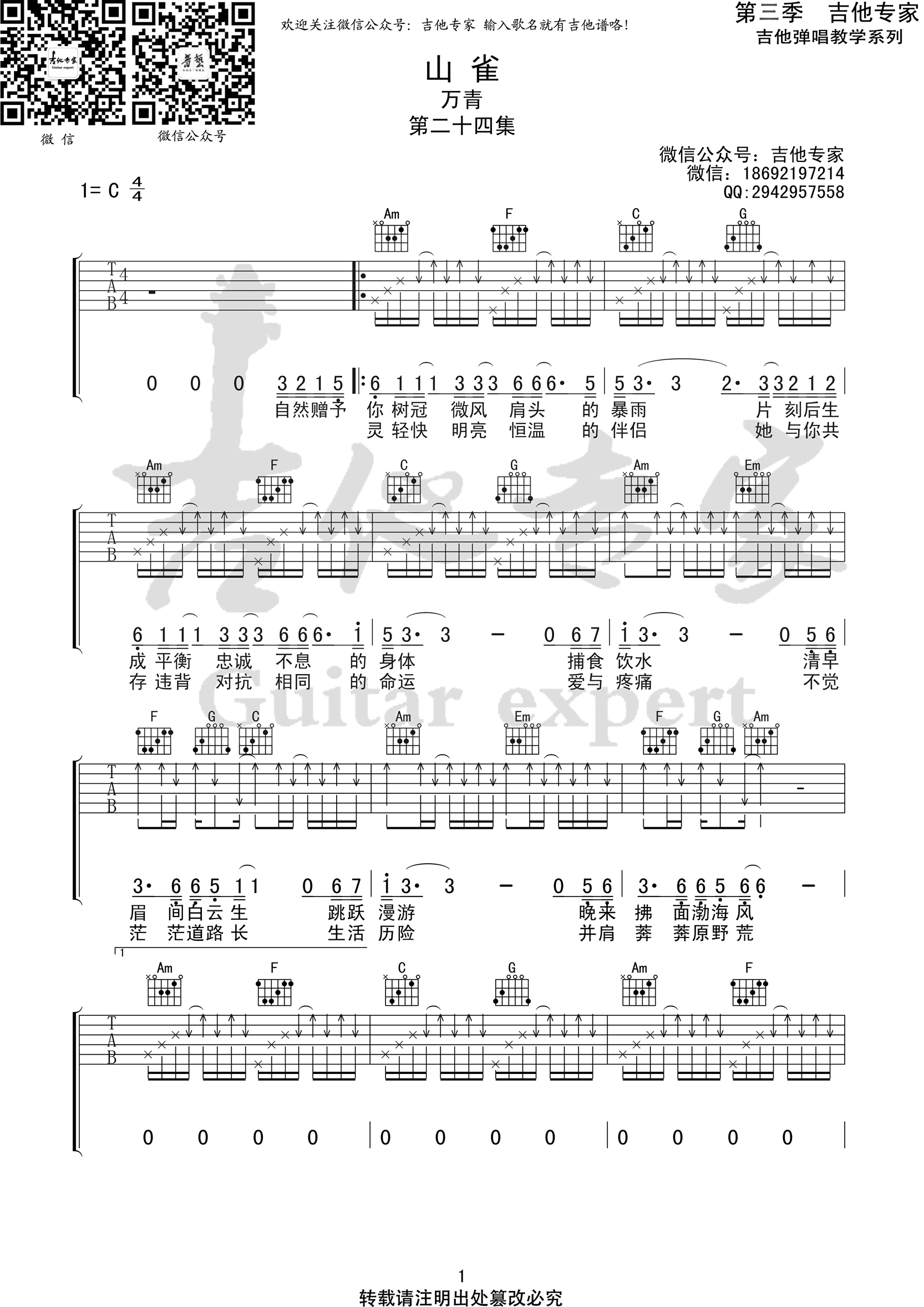 曲谱介绍: 万青旅店《山雀》吉他弹唱谱,采用C调指法编配,共有3张高清图谱。